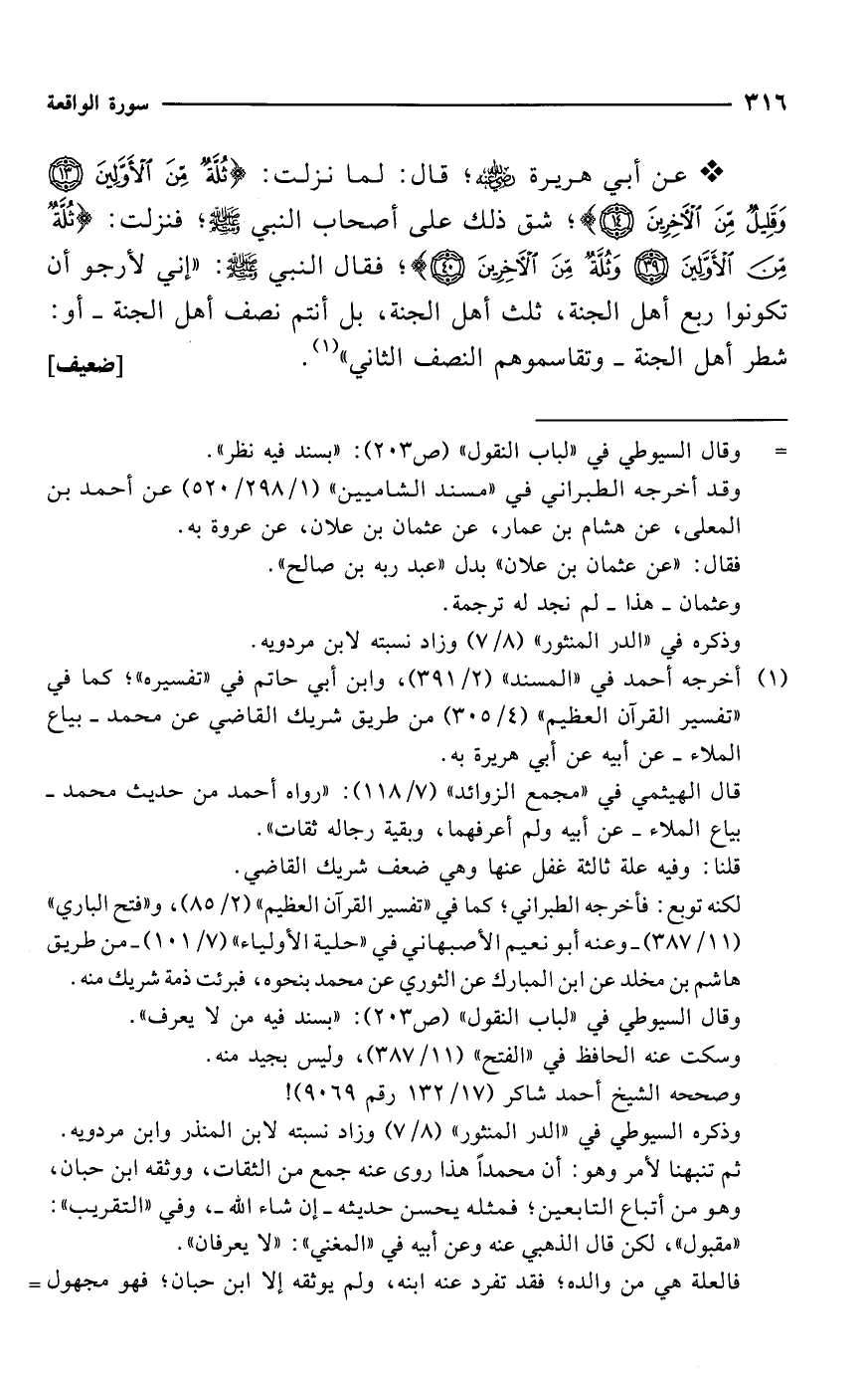 * عن أبي هريرة -رضي الله عنه-؛ قال: لما نزلت: {ثُلَّةٌ مِنَ الْأَوَّلِينَ (13) وَقَلِيلٌ مِنَ الْآخِرِينَ (14)}؛ شق ذلك على أصحاب النبي - صلى الله عليه وسلم -؛ فنزلت: {ثُلَّةٌ مِنَ الْأَوَّلِينَ (39) وَثُلَّةٌ مِنَ الْآخِرِينَ (40)}؛ فقال النبي - صلى الله عليه وسلم -: "إني لأرجو أن تكونوا ربع أهل الجنة، ثلث أهل الجنة، بل أنتم نصف أهل الجنة -أو: شطر أهل الجنة- وتقاسموهم النصف الثاني" (¬1). [ضعيف]