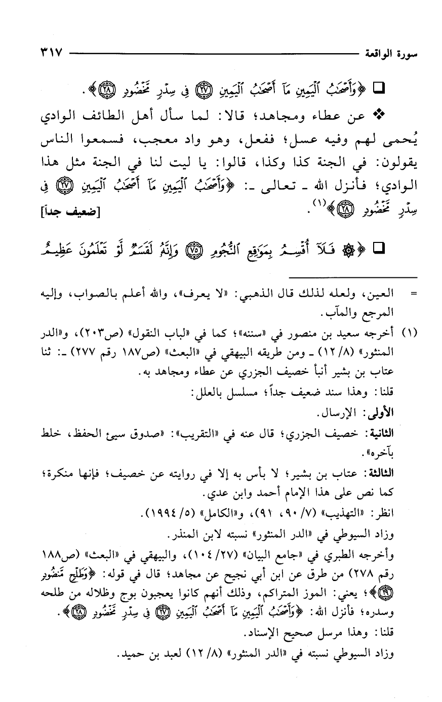 * عن عطاء ومجاهد؛ قالا: لما سأل أهل الطائف الوادي يُحمى لهم وفيه عسل؛ ففعل، وهو واد معجب، فسمعوا الناس يقولون: في الجنة كذا وكذا، قالوا: يا ليت لنا في الجنة مثل هذا الوادي؛ فأنزل الله -تعالى-: {وَأَصْحَابُ الْيَمِينِ مَا أَصْحَابُ الْيَمِينِ (27) فِي سِدْرٍ مَخْضُودٍ (28)} (¬1). [ضعيف جداً]
