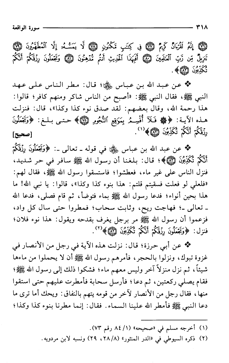 * عن عبد الله بن عباس -رضي الله عنهما-؛ قال: مطر الناس على عهد النبي - صلى الله عليه وسلم -، فقال النبي - صلى الله عليه وسلم -: "أصبح من الناس شاكر ومنهم كافر؛ قالوا: هذا رحمة الله، وقال بعضهم: لقد صدق نوء كذا وكذا"، قال: فنزلت هذه الآية: {فَلَا أُقْسِمُ بِمَوَاقِعِ النُّجُومِ (75)} حتى بلغ: {وَتَجْعَلُونَ رِزْقَكُمْ أَنَّكُمْ تُكَذِّبُونَ (82)} (¬1) [صحيح]