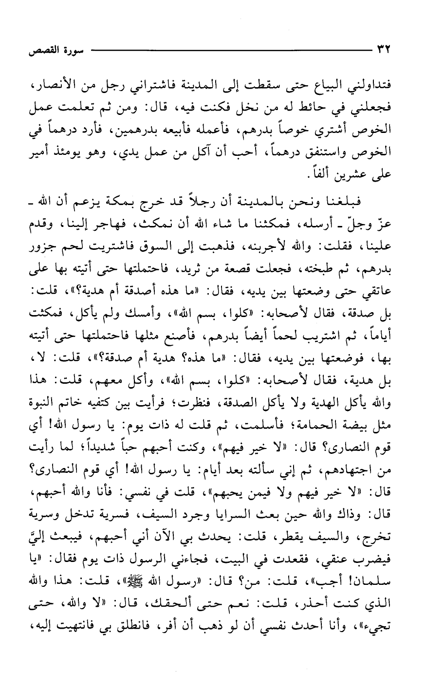 فبلغنا ونحن بالمدينة أن رجلاً قد خرج بمكة يزعم أن الله -عزّ وجلّ- أرسله، فمكثنا ما شاء الله أن نمكث، فهاجر إلينا، وقدم علينا، فقلت: والله لأجربنه، فذهبت إلى السوق فاشتريت لحم جزور بدرهم، ثم طبخته، فجعلت قصعة من ثريد، فاحتملتها حتى أتيته بها على عاتقي حتى وضعتها بين يديه، فقال: "ما هذه أصدقة أم هدية؟ "، قلت: بل صدقة، فقال لأصحابه: "كلوا، بسم الله"، وأمسك ولم يأكل، فمكثت أياماً، ثم اشتريب لحماً أيضاً بدرهم، فأصنع مثلها فاحتملتها حتى أتيته بها، فوضعتها بين يديه، فقال: "ما هذه؟ هدية أم صدقة؟ "، قلت: لا، بل هدية، فقال لأصحابه: "كلوا، بسم الله"، وأكل معهم، قلت: هذا والله يأكل الهدية ولا يأكل الصدقة، فنظرت؛ فرأيت بين كتفيه خاتم النبوة مثل بيضة الحمامة؛ فأسلمت، ثم قلت له ذات يوم: يا رسول الله! أي قوم النصارى؟ قال: "لا خير فيهم"، وكنت أحبهم حباً شديداً؛ لما رأيت من اجتهادهم، ثم إني سألته بعد أيام: يا رسول الله! أي قوم النصارى؟ قال: "لا خير فيهم ولا فيمن يحبهم"، قلت في نفسي: فأنا والله أحبهم، قال: وذاك والله حين بعث السرايا وجرد السيف، فسرية تدخل وسرية تخرج، والسيف يقطر، قلت: يحدث بي الآن أني أحبهم، فيبعث إليَّ فيضرب عنقي، فقعدت في البيت، فجاءني الرسول ذات يوم فقال: "يا سلمان! أجب"، قلت: من؟ قال: "رسول الله - صلى الله عليه وسلم -"، قلت: هذا والله الذي كنت أحذر، قلت: نعم حتى ألحقك، قال: "لا والله، حتى تجيء"، وأنا أحدث نفسي أن لو ذهب أن أفر، فانطلق بي فانتهيت إليه،