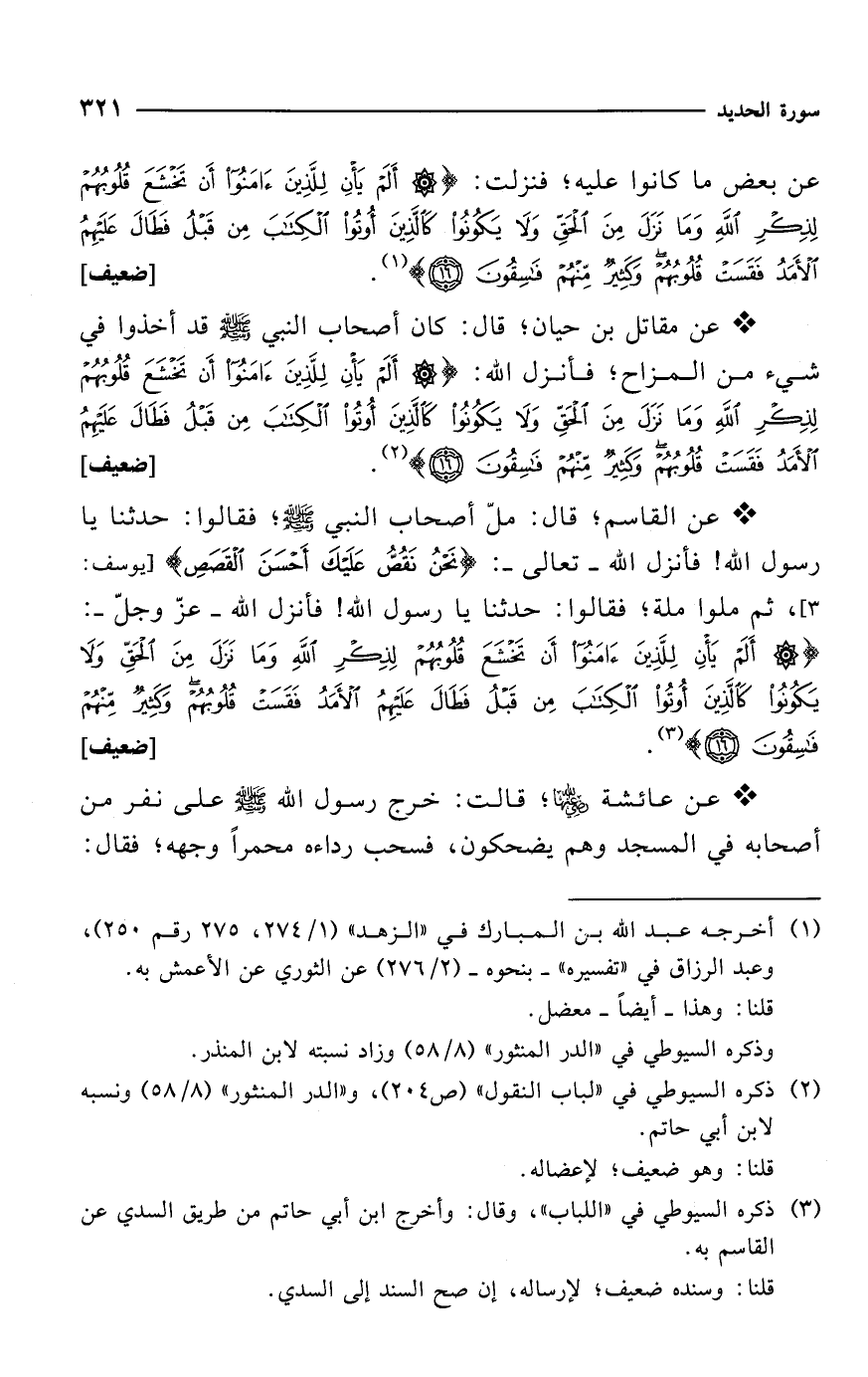 {أَلَمْ يَأْنِ لِلَّذِينَ آمَنُوا أَنْ تَخْشَعَ قُلُوبُهُمْ لِذِكْرِ اللَّهِ وَمَا نَزَلَ مِنَ الْحَقِّ وَلَا يَكُونُوا كَالَّذِينَ أُوتُوا الْكِتَابَ مِنْ قَبْلُ فَطَالَ عَلَيْهِمُ الْأَمَدُ فَقَسَتْ قُلُوبُهُمْ وَكَثِيرٌ مِنْهُمْ فَاسِقُونَ (16)} (¬3) [ضعيف]