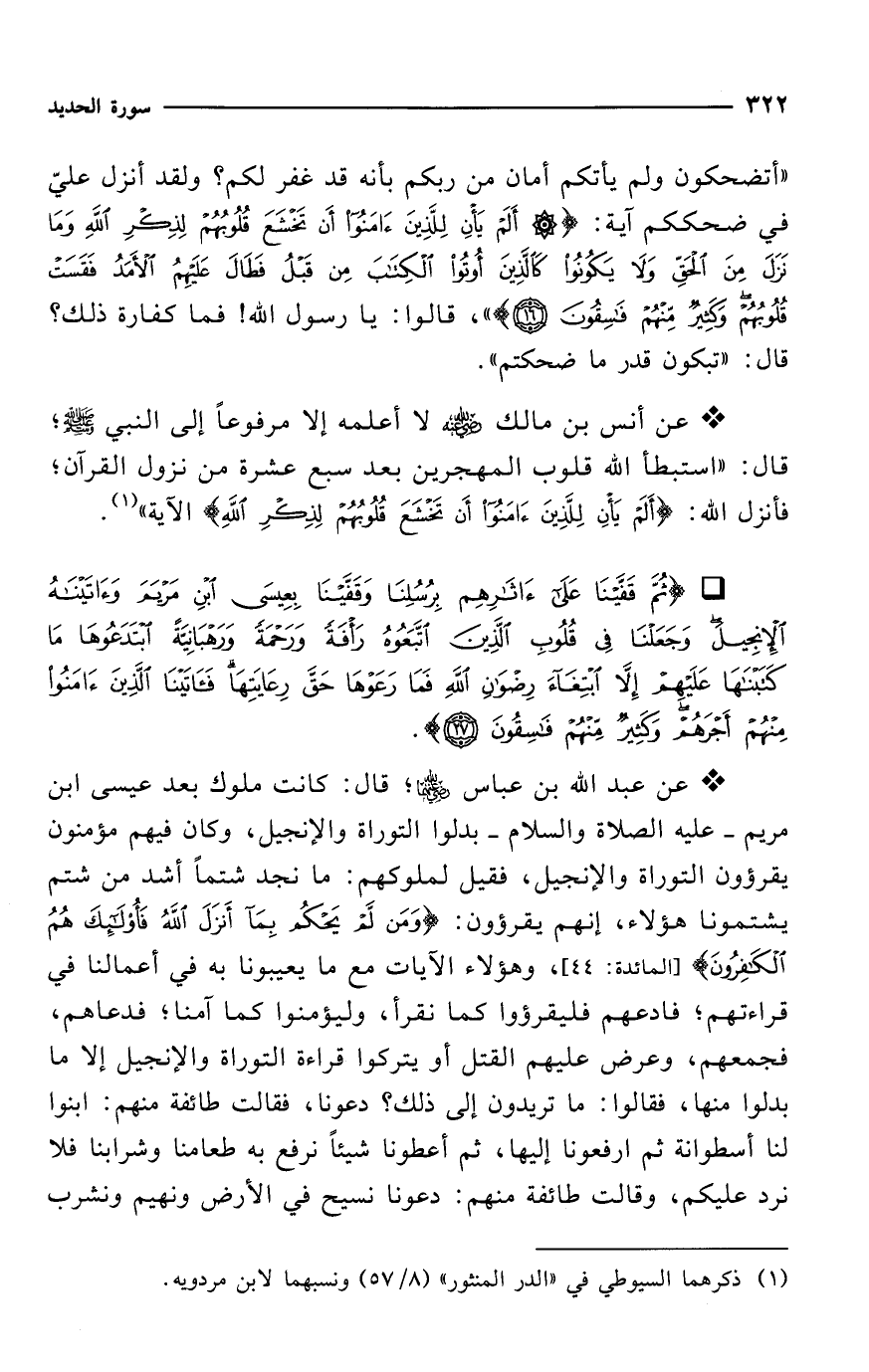 * عن أنس بن مالك -رضي الله عنه- لا أعلمه إلا مرفوعاً إلى النبي - صلى الله عليه وسلم -؛ قال: "استبطأ الله قلوب المهجرين بعد سبع عشرة من نزول القران؛ فأنزل الله: {أَلَمْ يَأْنِ لِلَّذِينَ آمَنُوا أَنْ تَخْشَعَ قُلُوبُهُمْ لِذِكْرِ اللَّهِ} الآية" (¬1).