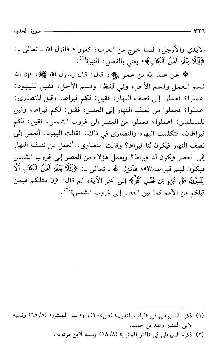 * عن عبد الله بن عمر -رضي الله عنهما-؛ قال: قال رسول الله - صلى الله عليه وسلم -: "إن الله قسم العمل وقسم الأجر، وفي لفظ: وقسم الأجل، فقيل لليهود: اعملوا؛ فعملوا إلى نصف النهار، فقيل: لكم قيراط، وقيل للنصارى: اعملوا؛ فعملوا من نصف النهار إلى العصر، فقيل: لكم قيراط، وقيل للمسلمين: اعملوا؛ فعملوا من العصر إلى غروب الشمس، فقيل: لكم قيراطان، فتكلمت اليهود والنصارى في ذلك، فقالت اليهود: أنعمل إلى نصف النهار فيكون لنا قيراط؟ وقالت النصارى: أنعمل من نصف النهار إلى العصر فيكون لنا قيراط؟ ويعمل هؤلاء من العصر إلى غروب الشمس فيكون لهم قيراطان؟ "؛ فأنزل الله -تعالى-: {لِئَلَّا يَعْلَمَ أَهْلُ الْكِتَابِ أَلَّا يَقْدِرُونَ عَلَى شَيْءٍ مِنْ فَضْلِ اللَّهِ} إلى آخر الآية، ثم قال: "إن مثلكم فيمن قبلكم من الأمم كما بين العصر إلى غروب الشمس" (¬2).
