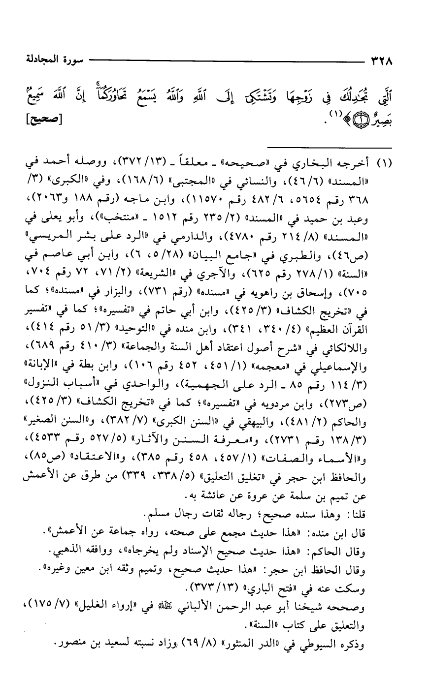 الَّتِي تُجَادِلُكَ فِي زَوْجِهَا وَتَشْتَكِي إِلَى اللَّهِ وَاللَّهُ يَسْمَعُ تَحَاوُرَكُمَا إِنَّ اللَّهَ سَمِيعٌ بَصِيرٌ} (¬1). [صحيح]
