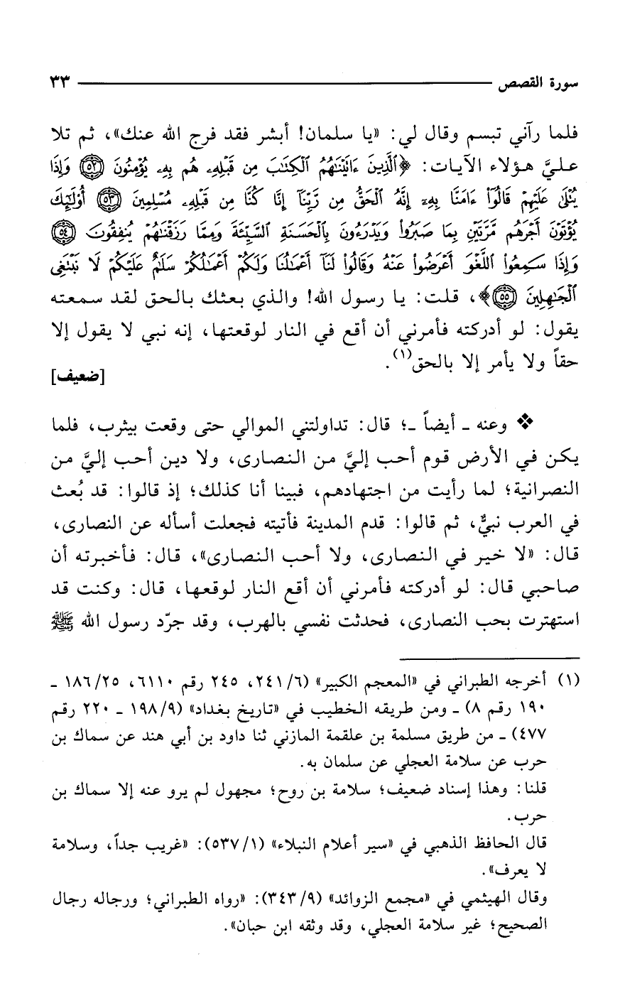 فلما رآني تبسم وقال لي: "يا سلمان! أبشر فقد فرج الله عنك"، ثم تلا عليَّ هؤلاء الآيات: {الَّذِينَ آتَيْنَاهُمُ الْكِتَابَ مِنْ قَبْلِهِ هُمْ بِهِ يُؤْمِنُونَ (52) وَإِذَا يُتْلَى عَلَيْهِمْ قَالُوا آمَنَّا بِهِ إِنَّهُ الْحَقُّ مِنْ رَبِّنَا إِنَّا كُنَّا مِنْ قَبْلِهِ مُسْلِمِينَ (53) أُولَئِكَ يُؤْتَوْنَ أَجْرَهُمْ مَرَّتَيْنِ بِمَا صَبَرُوا وَيَدْرَءُونَ بِالْحَسَنَةِ السَّيِّئَةَ وَمِمَّا رَزَقْنَاهُمْ يُنْفِقُونَ (54) وَإِذَا سَمِعُوا اللَّغْوَ أَعْرَضُوا عَنْهُ وَقَالُوا لَنَا أَعْمَالُنَا وَلَكُمْ أَعْمَالُكُمْ سَلَامٌ عَلَيْكُمْ لَا نَبْتَغِي الْجَاهِلِينَ (55)}، قلت: يا رسول الله! والذي بعثك بالحق لقد سمعته يقول: لو أدركته فأمرني أن أقع في النار لوقعتها، إنه نبي لا يقول إلا حقاً ولا يأمر إلا بالحق (¬1). [ضعيف]
