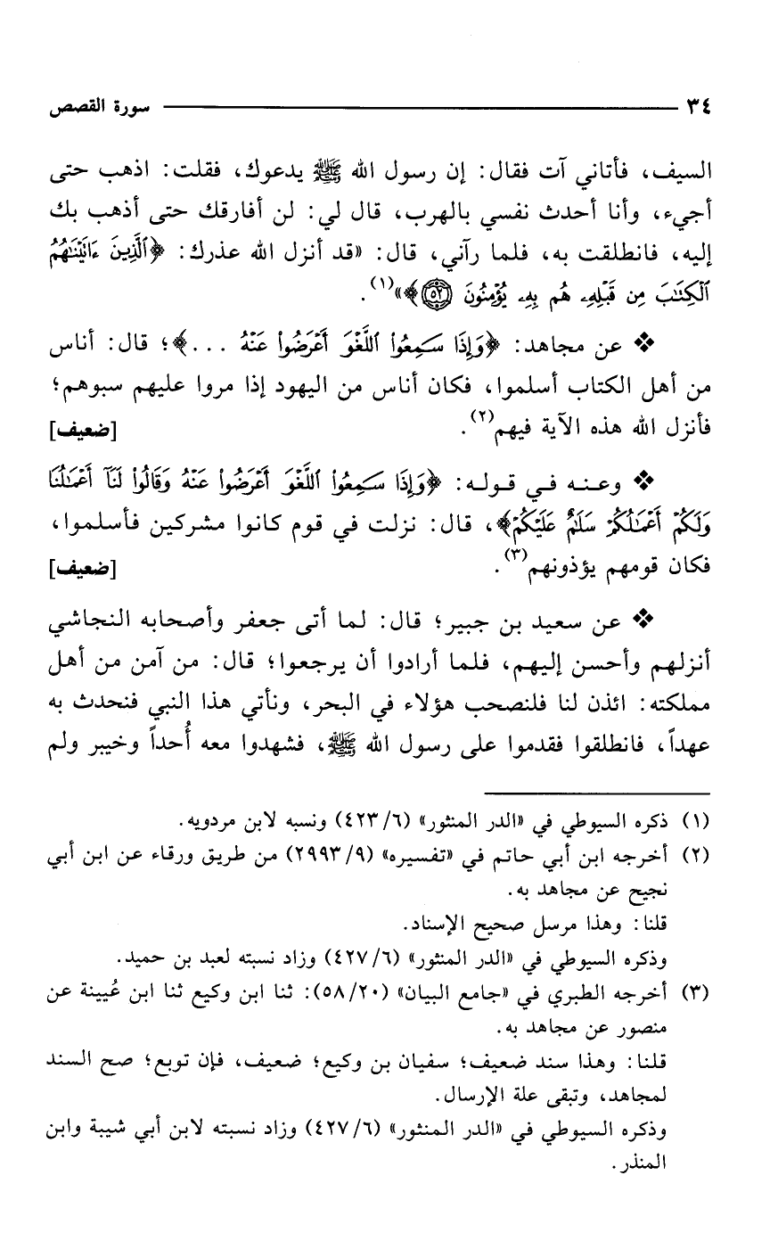 * عن مجاهد: {وَإِذَا سَمِعُوا اللَّغْوَ أَعْرَضُوا عَنْهُ. . .}؛ قال: أناس من أهل الكتاب أسلموا، فكان أناس من اليهود إذا مروا عليهم سبوهم؛ فأنزل الله هذه الآية فيهم (¬2). [ضعيف]