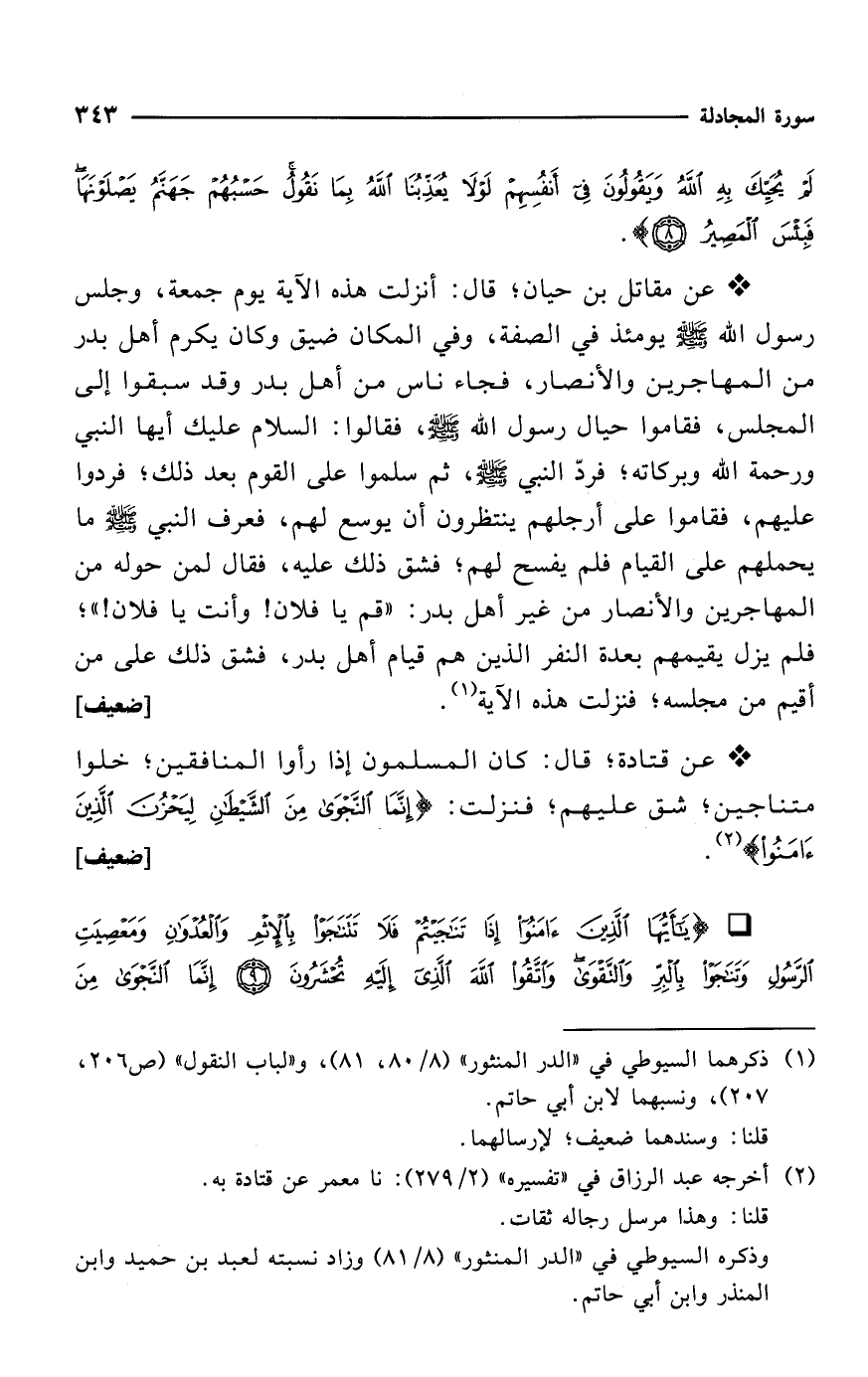 * عن قتادة؛ قال: كان المسلمون إذا رأوا المنافقين؛ خلوا متناجين؛ شق عليهم؛ فنزلت: {إِنَّمَا النَّجْوَى مِنَ الشَّيْطَانِ لِيَحْزُنَ الَّذِينَ آمَنُوا} (¬2). [ضعيف]