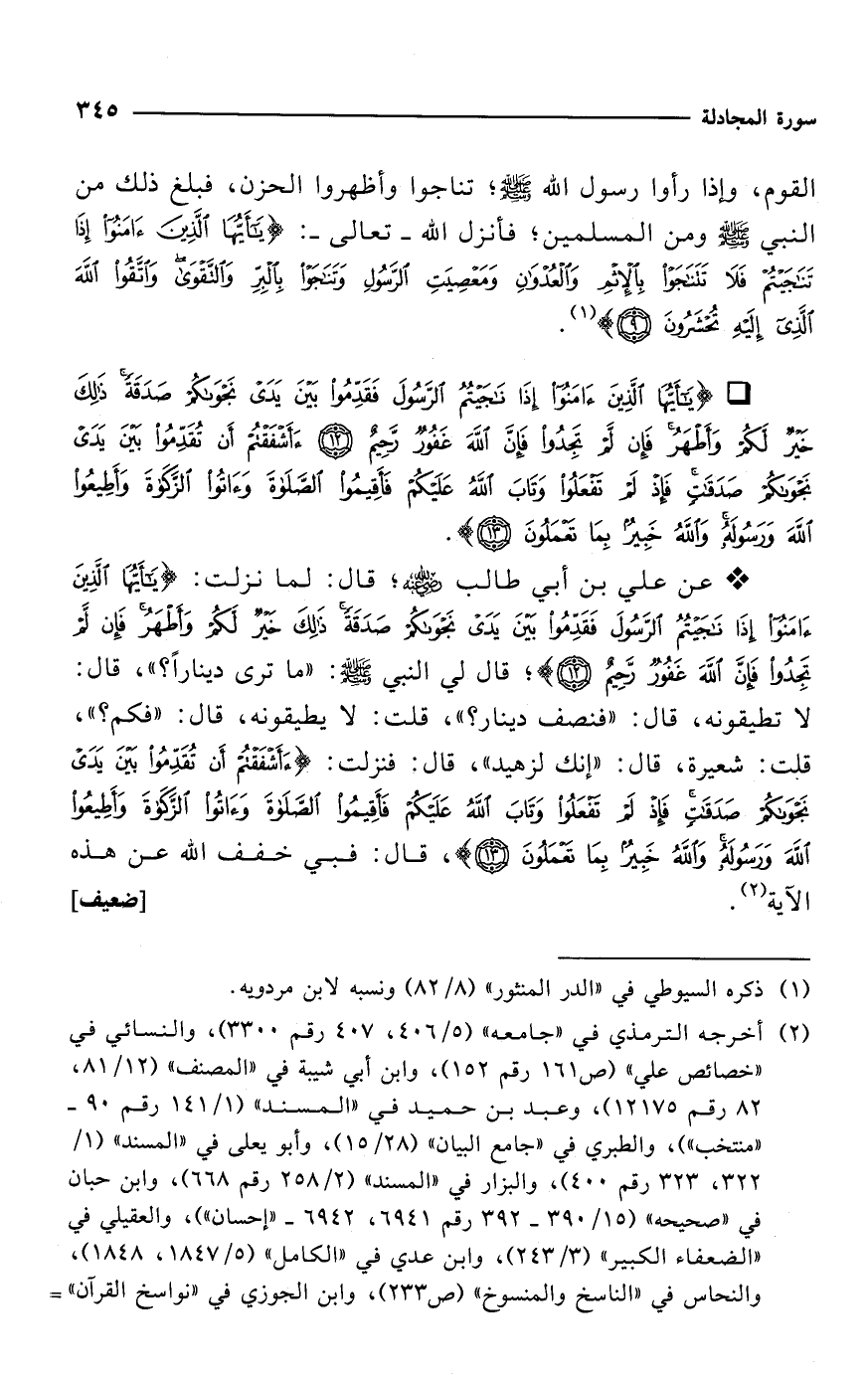 * {يَاأَيُّهَا الَّذِينَ آمَنُوا إِذَا نَاجَيْتُمُ الرَّسُولَ فَقَدِّمُوا بَيْنَ يَدَيْ نَجْوَاكُمْ صَدَقَةً ذَلِكَ خَيْرٌ لَكُمْ وَأَطْهَرُ فَإِنْ لَمْ تَجِدُوا فَإِنَّ اللَّهَ غَفُورٌ رَحِيمٌ (12) أَأَشْفَقْتُمْ أَنْ تُقَدِّمُوا بَيْنَ يَدَيْ نَجْوَاكُمْ صَدَقَاتٍ فَإِذْ لَمْ تَفْعَلُوا وَتَابَ اللَّهُ عَلَيْكُمْ فَأَقِيمُوا الصَّلَاةَ وَآتُوا الزَّكَاةَ وَأَطِيعُوا اللَّهَ وَرَسُولَهُ وَاللَّهُ خَبِيرٌ بِمَا تَعْمَلُونَ (13)}.