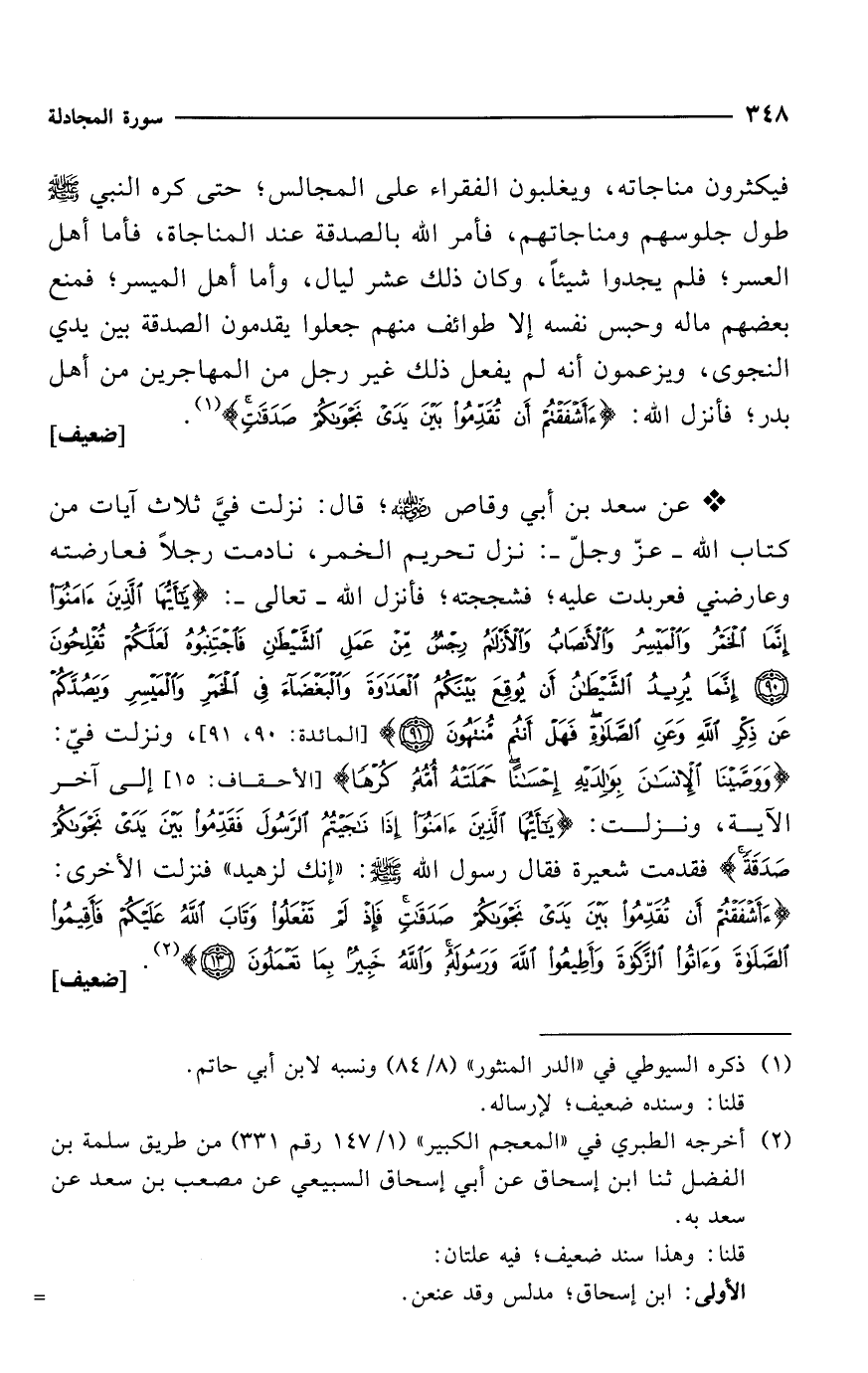 * عن سعد بن أبي وقاص -رضي الله عنه-؛ قال: نزلت فيَّ ثلاث آيات من كتاب الله -عزّ وجلّ-: نزل تحريم الخمر، نادمت رجلاً فعارضته وعارضني فعربدت عليه؛ فشججته؛ فأنزل الله -تعالى-: {يَاأَيُّهَا الَّذِينَ آمَنُوا إِنَّمَا الْخَمْرُ وَالْمَيْسِرُ وَالْأَنْصَابُ وَالْأَزْلَامُ رِجْسٌ مِنْ عَمَلِ الشَّيْطَانِ فَاجْتَنِبُوهُ لَعَلَّكُمْ تُفْلِحُونَ (90) إِنَّمَا يُرِيدُ الشَّيْطَانُ أَنْ يُوقِعَ بَيْنَكُمُ الْعَدَاوَةَ وَالْبَغْضَاءَ فِي الْخَمْرِ وَالْمَيْسِرِ وَيَصُدَّكُمْ عَنْ ذِكْرِ اللَّهِ وَعَنِ الصَّلَاةِ فَهَلْ أَنْتُمْ مُنْتَهُونَ (91)} [المائدة: 90، 91]، ونزلت فيّ: {وَوَصَّيْنَا الْإِنْسَانَ بِوَالِدَيْهِ إِحْسَانًا حَمَلَتْهُ أُمُّهُ كُرْهًا} [الأحقاف: 15] إلى آخر الآية، ونزلت: {يَاأَيُّهَا الَّذِينَ آمَنُوا إِذَا نَاجَيْتُمُ الرَّسُولَ فَقَدِّمُوا بَيْنَ يَدَيْ نَجْوَاكُمْ صَدَقَةً} فقدمت شعيرة فقال رسول الله - صلى الله عليه وسلم -: "إنك لزهيد" فنزلت الأخرى: {أَأَشْفَقْتُمْ أَنْ تُقَدِّمُوا بَيْنَ يَدَيْ نَجْوَاكُمْ صَدَقَاتٍ فَإِذْ لَمْ تَفْعَلُوا وَتَابَ اللَّهُ عَلَيْكُمْ فَأَقِيمُوا الصَّلَاةَ وَآتُوا الزَّكَاةَ وَأَطِيعُوا اللَّهَ وَرَسُولَهُ وَاللَّهُ خَبِيرٌ بِمَا تَعْمَلُونَ (13)} (¬2). [ضعيف]