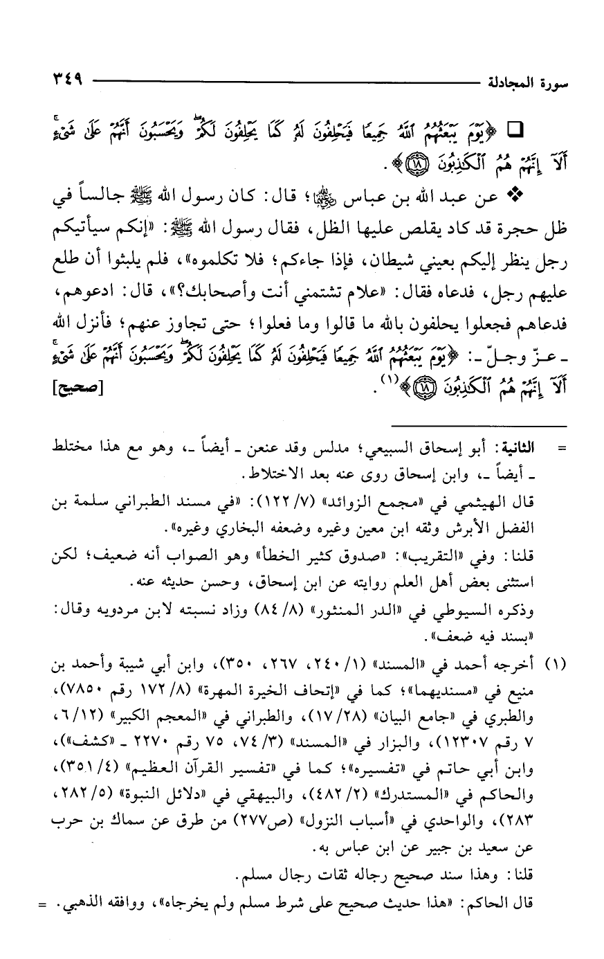 * عن عبد الله بن عباس -رضي الله عنهما-؛ قال: كان رسول الله - صلى الله عليه وسلم - جالساً في ظل حجرة قد كاد يقلص عليها الظل، فقال رسول الله - صلى الله عليه وسلم -: "إنكم سيأتيكم رجل ينظر إليكم بعيني شيطان، فإذا جاءكم؛ فلا تكلموه"، فلم يلبثوا أن طلع عليهم رجل، فدعاه فقال: "علام تشتمني أنت وأصحابك؟ "، قال: ادعوهم، فدعاهم فجعلوا يحلفون بالله ما قالوا وما فعلوا؛ حتى تجاوز عنهم؛ فأنزل الله -عزّ وجلّ-: {يَوْمَ يَبْعَثُهُمُ اللَّهُ جَمِيعًا فَيَحْلِفُونَ لَهُ كَمَا يَحْلِفُونَ لَكُمْ وَيَحْسَبُونَ أَنَّهُمْ عَلَى شَيْءٍ أَلَا إِنَّهُمْ هُمُ الْكَاذِبُونَ (18)} (¬1). [صحيح]