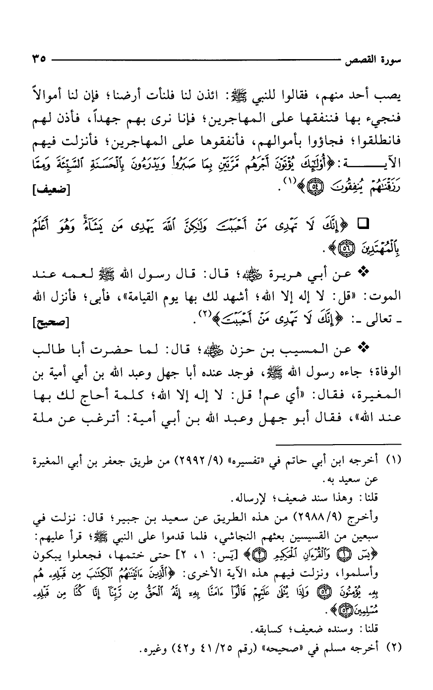 * عن أبي هريرة -رضي الله عنه-؛ قال: قال رسول الله - صلى الله عليه وسلم - لعمه عند الموت: "قل: لا إله إلا الله؛ أشهد لك بها يوم القيامة"، فأبى؛ فأنزل الله -تعالى-: {إِنَّكَ لَا تَهْدِي مَنْ أَحْبَبْتَ} (¬2). [صحيح]