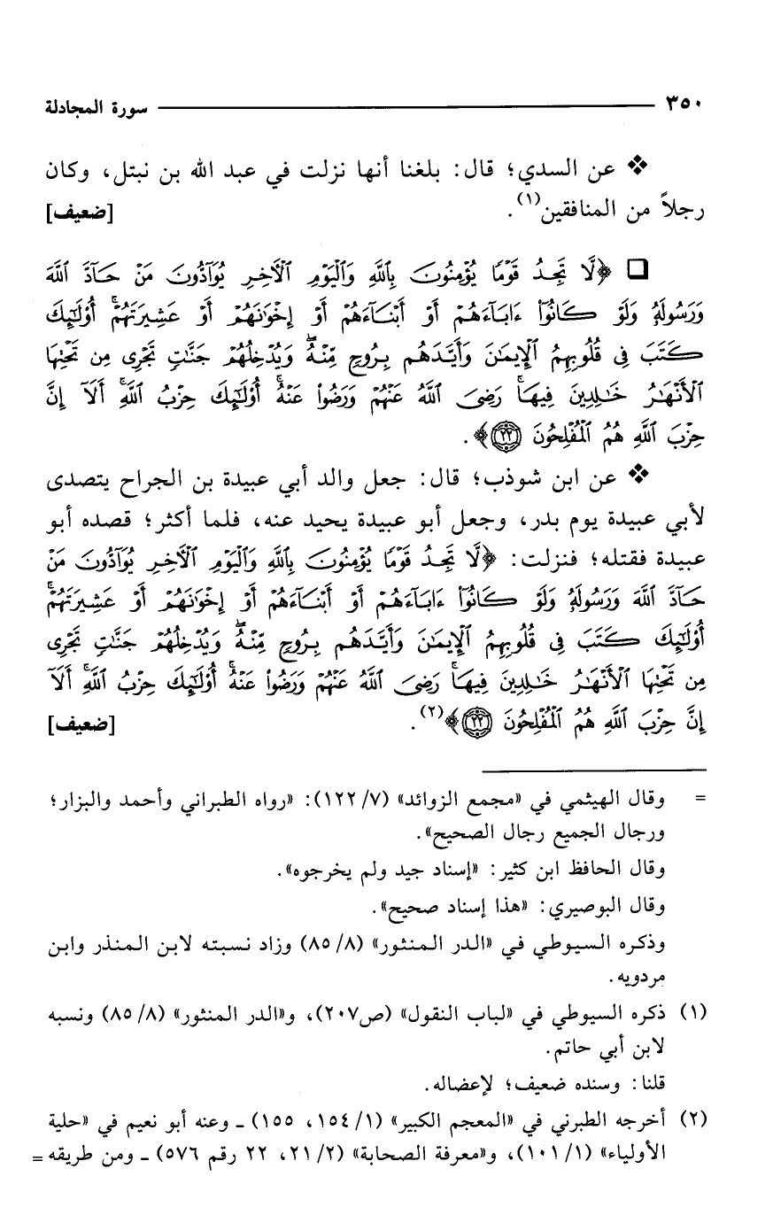 * عن ابن شوذب؛ قال: جعل والد أبي عبيدة بن الجراح يتصدى لأبي عبيدة يوم بدر، وجعل أبو عبيدة يحيد عنه، فلما أكثر؛ قصده أبو عبيدة فقتله؛ فنزلت: {لَا تَجِدُ قَوْمًا يُؤْمِنُونَ بِاللَّهِ وَالْيَوْمِ الْآخِرِ يُوَادُّونَ مَنْ حَادَّ اللَّهَ وَرَسُولَهُ وَلَوْ كَانُوا آبَاءَهُمْ أَوْ أَبْنَاءَهُمْ أَوْ إِخْوَانَهُمْ أَوْ عَشِيرَتَهُمْ أُولَئِكَ كَتَبَ فِي قُلُوبِهِمُ الْإِيمَانَ وَأَيَّدَهُمْ بِرُوحٍ مِنْهُ وَيُدْخِلُهُمْ جَنَّاتٍ تَجْرِي مِنْ تَحْتِهَا الْأَنْهَارُ خَالِدِينَ فِيهَا رَضِيَ اللَّهُ عَنْهُمْ وَرَضُوا عَنْهُ أُولَئِكَ حِزْبُ اللَّهِ أَلَا إِنَّ حِزْبَ اللَّهِ هُمُ الْمُفْلِحُونَ (22)} (¬2). [ضعيف]
