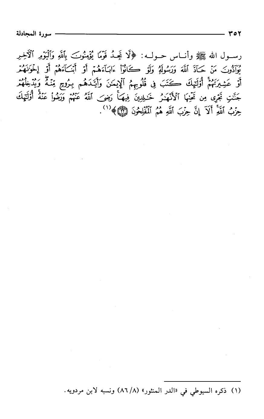رسول الله - صلى الله عليه وسلم - وأناس حوله: {لَا تَجِدُ قَوْمًا يُؤْمِنُونَ بِاللَّهِ وَالْيَوْمِ الْآخِرِ يُوَادُّونَ مَنْ حَادَّ اللَّهَ وَرَسُولَهُ وَلَوْ كَانُوا آبَاءَهُمْ أَوْ أَبْنَاءَهُمْ أَوْ إِخْوَانَهُمْ أَوْ عَشِيرَتَهُمْ أُولَئِكَ كَتَبَ فِي قُلُوبِهِمُ الْإِيمَانَ وَأَيَّدَهُمْ بِرُوحٍ مِنْهُ وَيُدْخِلُهُمْ جَنَّاتٍ تَجْرِي مِنْ تَحْتِهَا الْأَنْهَارُ خَالِدِينَ فِيهَا رَضِيَ اللَّهُ عَنْهُمْ وَرَضُوا عَنْهُ أُولَئِكَ حِزْبُ اللَّهِ أَلَا إِنَّ حِزْبَ اللَّهِ هُمُ الْمُفْلِحُونَ (22)} (¬1).