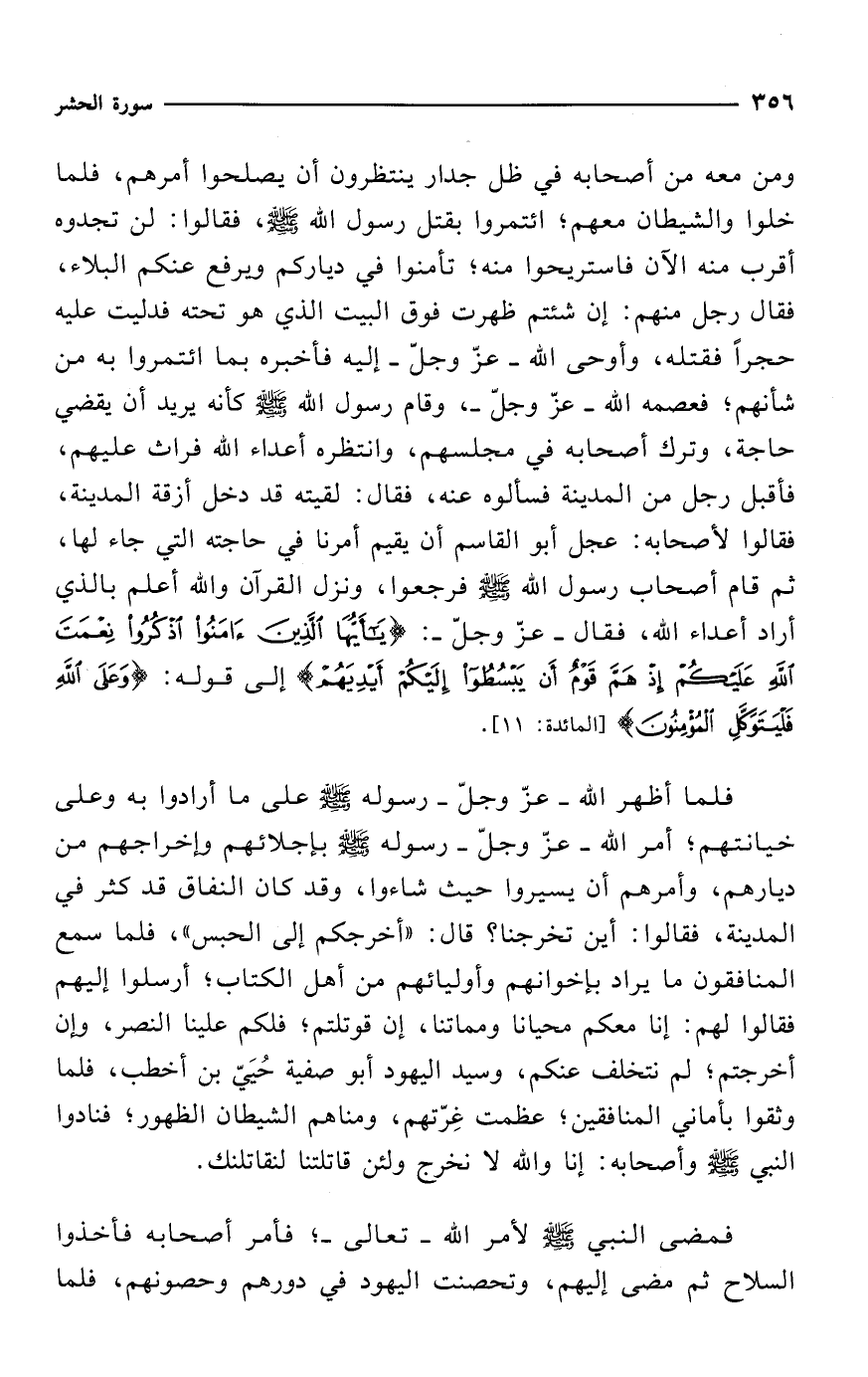 ومن معه من أصحابه في ظل جدار ينتظرون أن يصلحوا أمرهم، فلما خلوا والشيطان معهم؛ ائتمروا بقتل رسول الله - صلى الله عليه وسلم -، فقالوا: لن تجدوه أقرب منه الآن فاستريحوا منه؛ تأمنوا في دياركم ويرفع عنكم البلاء، فقال رجل منهم: إن شئتم ظهرت فوق البيت الذي هو تحته فدليت عليه حجراً فقتله، وأوحى الله -عزّ وجلّ- إليه فأخبره بما ائتمروا به من شأنهم؛ فعصمه الله -عزّ وجلّ-، وقام رسول الله - صلى الله عليه وسلم - كأنه يريد أن يقضي حاجة، وترك أصحابه في مجلسهم، وانتظره أعداء الله فراث عليهم، فأقبل رجل من المدينة فسألوه عنه، فقال: لقيته قد دخل أزقة المدينة، فقالوا لأصحابه: عجل أبو القاسم أن يقيم أمرنا في حاجته التي جاء لها، ثم قام أصحاب رسول الله - صلى الله عليه وسلم - فرجعوا، ونزل القرآن والله أعلم بالذي أراد أعداء الله، فقال -عزّ وجلّ-: {يَاأَيُّهَا الَّذِينَ آمَنُوا اذْكُرُوا نِعْمَتَ اللَّهِ عَلَيْكُمْ إِذْ هَمَّ قَوْمٌ أَنْ يَبْسُطُوا إِلَيْكُمْ أَيْدِيَهُمْ} إلى قوله: {وَعَلَى اللَّهِ فَلْيَتَوَكَّلِ الْمُؤْمِنُونَ (11)} [المائدة: 11].