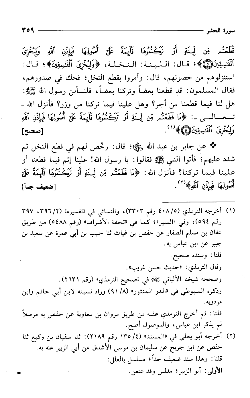 قَطَعْتُمْ مِنْ لِينَةٍ أَوْ تَرَكْتُمُوهَا قَائِمَةً عَلَى أُصُولِهَا فَبِإِذْنِ اللَّهِ وَلِيُخْزِيَ الْفَاسِقِينَ (5)}؛ قال: اللينة: النخلة، {وَلِيُخْزِيَ الْفَاسِقِينَ}؛ قال: استنزلوهم من حصونهم، قال: وأمروا بقطع النخل؛ فحك في صدورهم، فقال المسلمون: قد قطعنا بعضاً وتركنا بعضاً، فلنسألن رسول الله - صلى الله عليه وسلم -: هل لنا فيما قطعنا من أجر؟ وهل علينا فيما تركنا من وزر؟ فأنزل الله -تعالى-: {مَا قَطَعْتُمْ مِنْ لِينَةٍ أَوْ تَرَكْتُمُوهَا قَائِمَةً عَلَى أُصُولِهَا فَبِإِذْنِ اللَّهِ وَلِيُخْزِيَ الْفَاسِقِينَ (5)} (¬1). [صحيح]