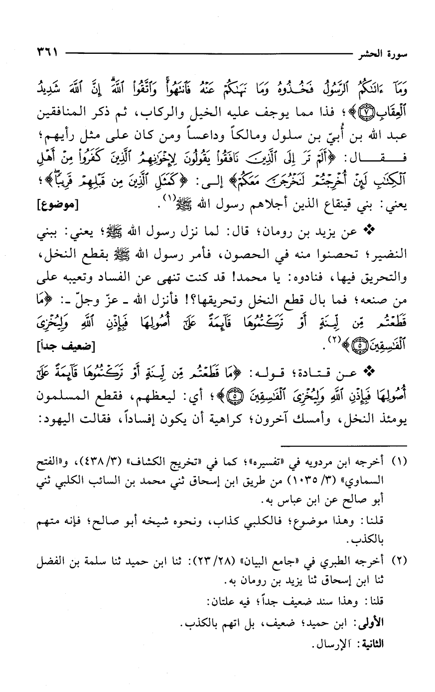 * عن يزيد بن رومان؛ قال: لما نزل رسول الله - صلى الله عليه وسلم -؛ يعني: ببني النضير؛ تحصنوا منه في الحصون، فأمر رسول الله - صلى الله عليه وسلم - بقطع النخل، والتحريق فيها، فنادوه: يا محمد! قد كنت تنهى عن الفساد وتعيبه على من صنعه؛ فما بال قطع النخل وتحريقها؟! فأنزل الله -عزّ وجلّ-: {مَا قَطَعْتُمْ مِنْ لِينَةٍ أَوْ تَرَكْتُمُوهَا قَائِمَةً عَلَى أُصُولِهَا فَبِإِذْنِ اللَّهِ وَلِيُخْزِيَ الْفَاسِقِينَ (5)} (¬2). [ضعيف جداً]