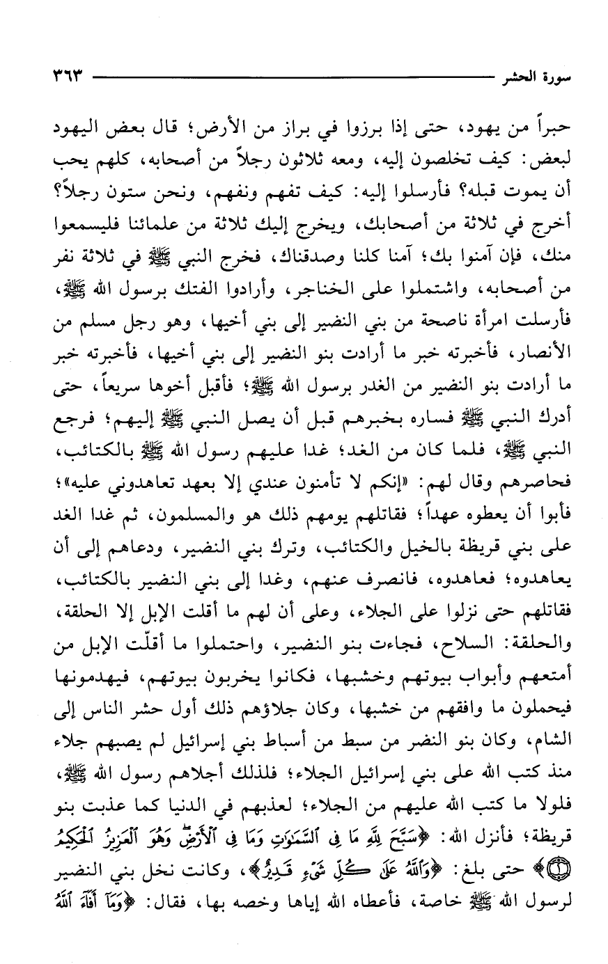 حبراً من يهود، حتى إذا برزوا في براز من الأرض؛ قال بعض اليهود لبعض: كيف تخلصون إليه، ومعه ثلاثون رجلاً من أصحابه، كلهم يحب أن يموت قبله؟ فأرسلوا إليه: كيف تفهم ونفهم، ونحن ستون رجلاً؟ أخرج في ثلاثة من أصحابك، ويخرج إليك ثلاثة من علمائنا فليسمعوا منك، فإن آمنوا بك؛ آمنا كلنا وصدقناك، فخرج النبي - صلى الله عليه وسلم - في ثلاثة نفر من أصحابه، واشتملوا على الخناجر، وأرادوا الفتك برسول الله - صلى الله عليه وسلم -، فأرسلت امرأة ناصحة من بني النضير إلى بني أخيها، وهو رجل مسلم من الأنصار، فأخبرته خبر ما أرادت بنو النضير إلى بني أخيها، فأخبرته خبر ما أرادت بنو النضير من الغدر برسول الله - صلى الله عليه وسلم -؛ فأقبل أخوها سريعاً، حتى أدرك النبي - صلى الله عليه وسلم - فساره بخبرهم قبل أن يصل النبي - صلى الله عليه وسلم - إليهم؛ فرجع النبي - صلى الله عليه وسلم -، فلما كان من الغد؛ غدا عليهم رسول الله - صلى الله عليه وسلم - بالكتائب، فحاصرهم وقال لهم: "إنكم لا تأمنون عندي إلا بعهد تعاهدوني عليه"؛ فأبوا أن يعطوه عهداً؛ فقاتلهم يومهم ذلك هو والمسلمون، ثم غدا الغد على بني قريظة بالخيل والكتائب، وترك بني النضير، ودعاهم إلى أن يعاهدوه؛ فعاهدوه، فانصرف عنهم، وغدا إلى بني النضير بالكتائب، فقاتلهم حتى نزلوا على الجلاء، وعلى أن لهم ما أقلت الإبل إلا الحلقة، والحلقة: السلاح، فجاءت بنو النضير، واحتملوا ما أقلّت الإبل من أمتعهم وأبواب بيوتهم وخشبها، فكانوا يخربون بيوتهم، فيهدمونها فيحملون ما وافقهم من خشبها، وكان جلاؤهم ذلك أول حشر الناس إلى الشام، وكان بنو النضر من سبط من أسباط بني إسرائيل لم يصبهم جلاء منذ كتب الله على بني إسرائيل الجلاء؛ فلذلك أجلاهم رسول الله - صلى الله عليه وسلم -، فلولا ما كتب الله عليهم من الجلاء؛ لعذبهم في الدنيا كما عذبت بنو قريظة؛ فأنزل الله: {سَبَّحَ لِلَّهِ مَا فِي السَّمَاوَاتِ وَمَا فِي الْأَرْضِ وَهُوَ الْعَزِيزُ الْحَكِيمُ (1)} حتى بلغ: {وَاللَّهُ عَلَى كُلِّ شَيْءٍ قَدِيرٌ}، وكانت نخل بني النضير لرسول الله - صلى الله عليه وسلم - خاصة، فأعطاه الله إياها وخصه بها، فقال: {مَا أَفَاءَ اللَّهُ