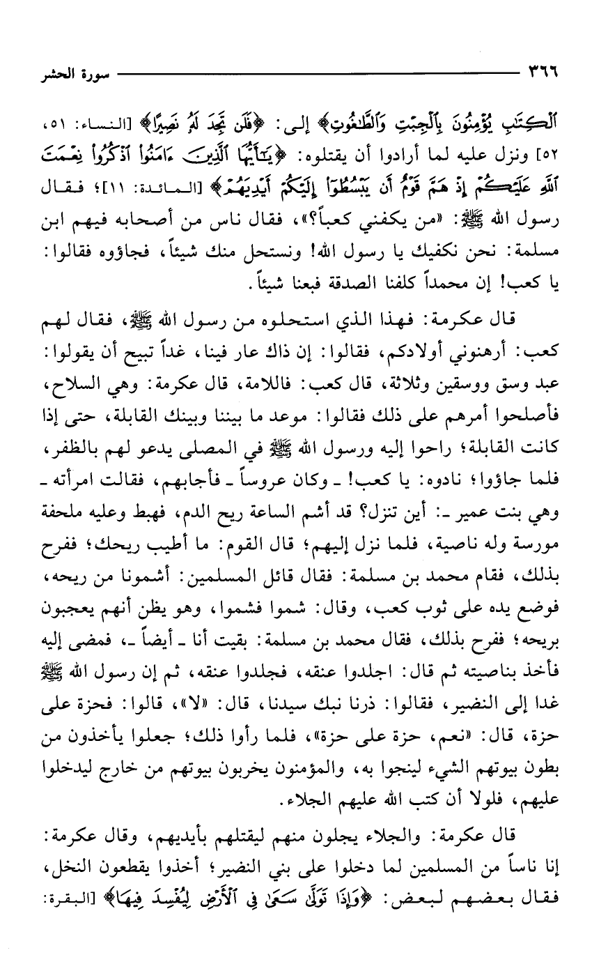 قال عكرمة: فهذا الذي استحلوه من رسول الله - صلى الله عليه وسلم -، فقال لهم كعب: أرهنوني أولادكم، فقالوا: إن ذاك عار فينا، غداً تبيح أن يقولوا: عبد وسق ووسقين وثلاثة، قال كعب: فاللامة، قال عكرمة: وهي السلاح، فأصلحوا أمرهم على ذلك فقالوا: موعد ما بيننا وبينك القابلة، حتى إذا كانت القابلة؛ راحوا إليه ورسول الله - صلى الله عليه وسلم - في المصلى يدعو لهم بالظفر، فلما جاؤوا؛ نادوه: يا كعب! -وكان عروساً- فأجابهم، فقالت امرأته -وهي بنت عمير-: أين تنزل؟ قد أشم الساعة ريح الدم، فهبط وعليه ملحفة مورسة وله ناصية، فلما نزل إليهم؛ قال القوم: ما أطيب ريحك؛ ففرح بذلك، فقام محمد بن مسلمة: فقال قائل المسلمين: أشمونا من ريحه، فوضع يده على ثوب كعب، وقال: شموا فشموا، وهو يظن أنهم يعجبون بريحه؛ ففرح بذلك، فقال محمد بن مسلمة: بقيت أنا -أيضاً-، فمضى إليه فأخذ بناصيته ثم قال: اجلدوا عنقه، فجلدوا عنقه، ثم إن رسول الله - صلى الله عليه وسلم - غدا إلى النضير، فقالوا: ذرنا نبك سيدنا، قال: "لا"، قالوا: فحزة على حزة، قال: "نعم، حزة على حزة"، فلما رأوا ذلك؛ جعلوا يأخذون من بطون بيوتهم الشيء لينجوا به، والمؤمنون يخربون بيوتهم من خارج ليدخلوا عليهم، فلولا أن كتب الله عليهم الجلاء.