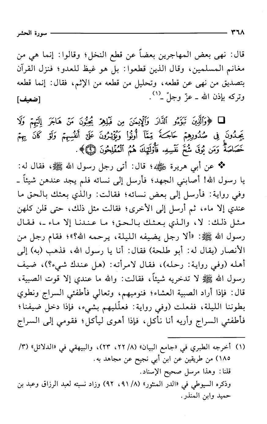* {وَالَّذِينَ تَبَوَّءُوا الدَّارَ وَالْإِيمَانَ مِنْ قَبْلِهِمْ يُحِبُّونَ مَنْ هَاجَرَ إِلَيْهِمْ وَلَا يَجِدُونَ فِي صُدُورِهِمْ حَاجَةً مِمَّا أُوتُوا وَيُؤْثِرُونَ عَلَى أَنْفُسِهِمْ وَلَوْ كَانَ بِهِمْ خَصَاصَةٌ وَمَنْ يُوقَ شُحَّ نَفْسِهِ فَأُولَئِكَ هُمُ الْمُفْلِحُونَ (9)}.