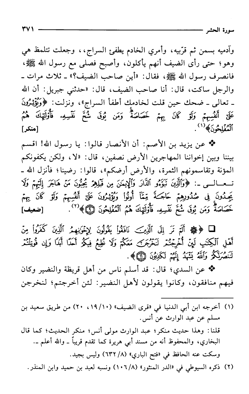 * عن يزيد بن الأصم: أن الأنصار قالوا: يا رسول الله! اقسم بيننا وبين إخواننا المهاجرين الأرض نصفين، قال: "لا، ولكن يكفونكم المؤنة وتقاسمونهم الثمرة، والأرض أرضكم"، قالوا: رضينا؛ فأنزل الله -تعالى-: {وَالَّذِينَ تَبَوَّءُوا الدَّارَ وَالْإِيمَانَ مِنْ قَبْلِهِمْ يُحِبُّونَ مَنْ هَاجَرَ إِلَيْهِمْ وَلَا يَجِدُونَ فِي صُدُورِهِمْ حَاجَةً مِمَّا أُوتُوا وَيُؤْثِرُونَ عَلَى أَنْفُسِهِمْ وَلَوْ كَانَ بِهِمْ خَصَاصَةٌ وَمَنْ يُوقَ شُحَّ نَفْسِهِ فَأُولَئِكَ هُمُ الْمُفْلِحُونَ (9)} (¬2). [ضعيف]