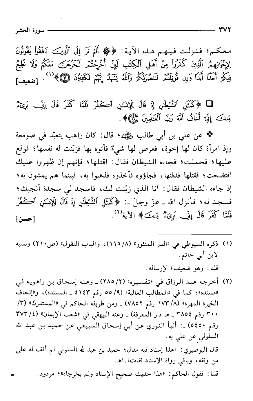 * عن علي بن أبي طالب -رضي الله عنه-؛ قال: كان راهب يتعبّد في صومعة وإذ امرأة كان لها إخوة، فعرض لها شيءٌ فأتوه بها فزيّنت له نفسها؛ فوقع عليها؛ فحملت؛ فجاءه الشيطان فقال: اقتلها؛ فإنهم إن ظهروا عليك افتضحت؛ فقتلها فدفنها، فجاؤوه فأخذوه فذهبوا به، فبينما هم يمشون به؛ إذ جاءه الشيطان فقال: أنا الذي زيّنت لك، فاسجد لي سجدة أنجيك؛ فسجد له؛ فأنزل الله -عزّ وجلّ-: {كَمَثَلِ الشَّيْطَانِ إِذْ قَالَ لِلْإِنْسَانِ اكْفُرْ فَلَمَّا كَفَرَ قَالَ إِنِّي بَرِيءٌ مِنْكَ} الآية (¬2). [حسن]