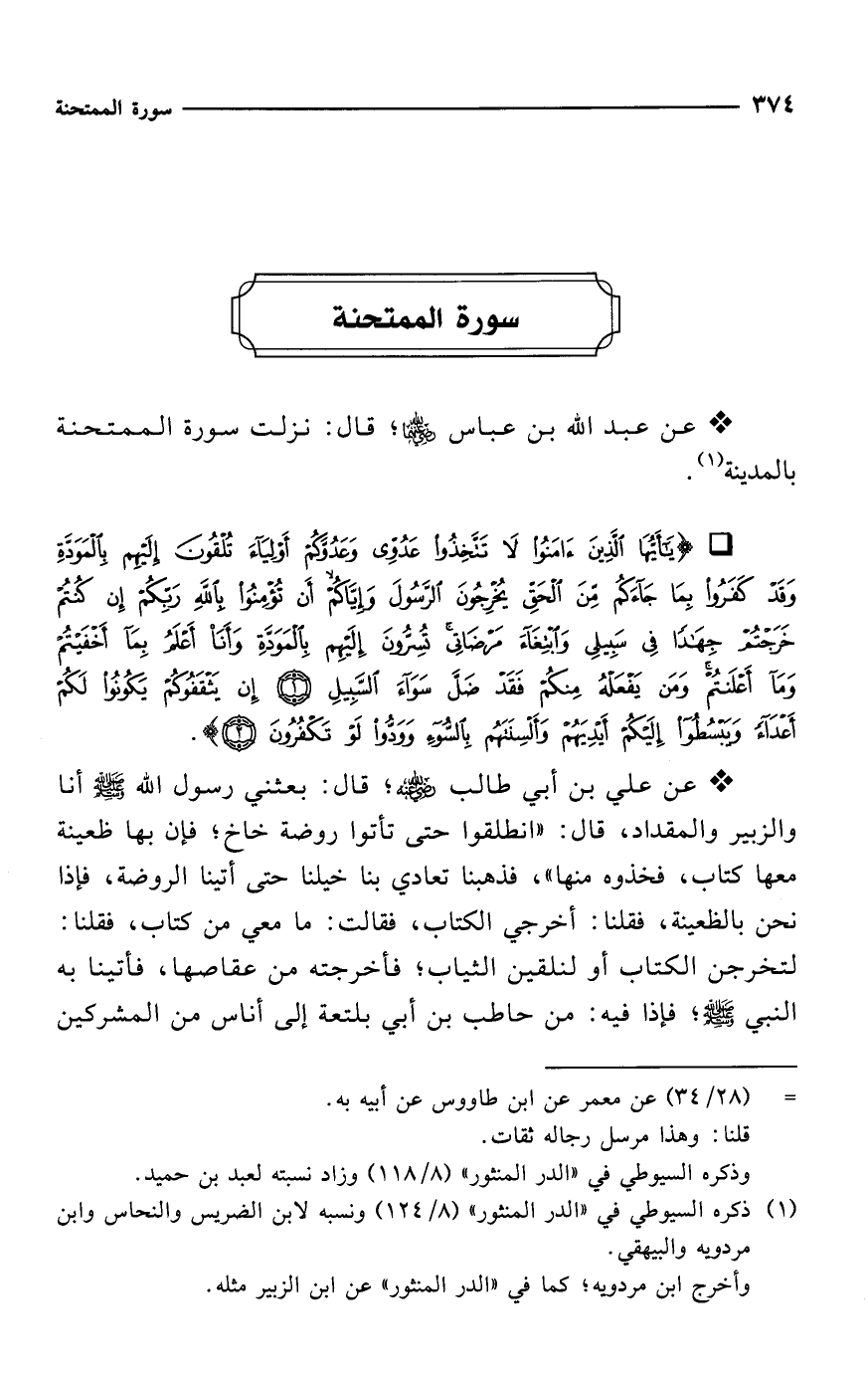* {يَاأَيُّهَا الَّذِينَ آمَنُوا لَا تَتَّخِذُوا عَدُوِّي وَعَدُوَّكُمْ أَوْلِيَاءَ تُلْقُونَ إِلَيْهِمْ بِالْمَوَدَّةِ وَقَدْ كَفَرُوا بِمَا جَاءَكُمْ مِنَ الْحَقِّ يُخْرِجُونَ الرَّسُولَ وَإِيَّاكُمْ أَنْ تُؤْمِنُوا بِاللَّهِ رَبِّكُمْ إِنْ كُنْتُمْ خَرَجْتُمْ جِهَادًا فِي سَبِيلِي وَابْتِغَاءَ مَرْضَاتِي تُسِرُّونَ إِلَيْهِمْ بِالْمَوَدَّةِ وَأَنَا أَعْلَمُ بِمَا أَخْفَيْتُمْ وَمَا أَعْلَنْتُمْ وَمَنْ يَفْعَلْهُ مِنْكُمْ فَقَدْ ضَلَّ سَوَاءَ السَّبِيلِ (1) إِنْ يَثْقَفُوكُمْ يَكُونُوا لَكُمْ أَعْدَاءً وَيَبْسُطُوا إِلَيْكُمْ أَيْدِيَهُمْ وَأَلْسِنَتَهُمْ بِالسُّوءِ وَوَدُّوا لَوْ تَكْفُرُونَ (2) لَنْ تَنْفَعَكُمْ أَرْحَامُكُمْ وَلَا أَوْلَادُكُمْ يَوْمَ الْقِيَامَةِ يَفْصِلُ بَيْنَكُمْ وَاللَّهُ بِمَا تَعْمَلُونَ بَصِيرٌ (3)}.