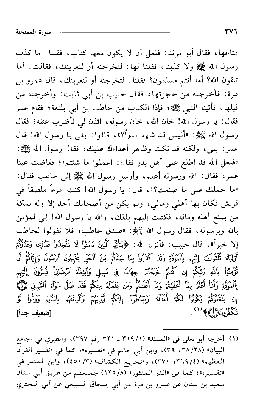 متاعها، فقال أبو مرثد: فلعل أن لا يكون معها كتاب، فقلنا: ما كذب رسول الله - صلى الله عليه وسلم - ولا كذبنا، فقلنا لها: لتخرجنه أو لنعرينك، فقالت: أما تتقون الله؟ أما أنتم مسلمون؟ فقلنا: لتخرجنه أو لنعرينك، قال عمرو بن مرة: فأخرجته من حجزتها، فقال حبيب بن أبي ثابت: وأخرجته من قبلها، فأتينا النبي - صلى الله عليه وسلم -؛ فإذا الكتاب من حاطب بن أبي بلتعة؛ فقام عمر فقال: يا رسول الله! خان الله، خان رسوله، ائذن لي فأضرب عنقه؛ فقال رسول الله - صلى الله عليه وسلم -: "أليس قد شهد بدراً؟ "، قالوا: بلى يا رسول الله! قال عمر: بلى، ولكنه قد نكث وظاهر أعداءك عليك، فقال رسول الله - صلى الله عليه وسلم -: "فلعل الله قد اطلع على أهل بدر فقال: اعملوا ما شئتم"؛ ففاضت عينا عمر، فقال: الله ورسوله أعلم، وأرسل رسول الله - صلى الله عليه وسلم - إلى حاطب فقال: "ما حملك على ما صنعت؟ "، قال: يا رسول الله! كنت امرءاً ملصقاً في قريش فكان بها أهلي ومالي، ولم يكن من أصحابك أحد إلا وله بمكة من يمنع أهله وماله، فكتبت إليهم بذلك، والله يا رسول الله! إني لمؤمن بالله وبرسوله، فقال رسول الله - صلى الله عليه وسلم -: "صدق حاطب؛ فلا تقولوا لحاطب إلا خيراً"، قال حبيب: فأنزل الله: {يَاأَيُّهَا الَّذِينَ آمَنُوا لَا تَتَّخِذُوا عَدُوِّي وَعَدُوَّكُمْ أَوْلِيَاءَ تُلْقُونَ إِلَيْهِمْ بِالْمَوَدَّةِ وَقَدْ كَفَرُوا بِمَا جَاءَكُمْ مِنَ الْحَقِّ يُخْرِجُونَ الرَّسُولَ وَإِيَّاكُمْ أَنْ تُؤْمِنُوا بِاللَّهِ رَبِّكُمْ إِنْ كُنْتُمْ خَرَجْتُمْ جِهَادًا فِي سَبِيلِي وَابْتِغَاءَ مَرْضَاتِي تُسِرُّونَ إِلَيْهِمْ بِالْمَوَدَّةِ وَأَنَا أَعْلَمُ بِمَا أَخْفَيْتُمْ وَمَا أَعْلَنْتُمْ وَمَنْ يَفْعَلْهُ مِنْكُمْ فَقَدْ ضَلَّ سَوَاءَ السَّبِيلِ (1) إِنْ يَثْقَفُوكُمْ يَكُونُوا لَكُمْ أَعْدَاءً وَيَبْسُطُوا إِلَيْكُمْ أَيْدِيَهُمْ وَأَلْسِنَتَهُمْ بِالسُّوءِ وَوَدُّوا لَوْ تَكْفُرُونَ (2)} (¬1). [ضعيف جداً]