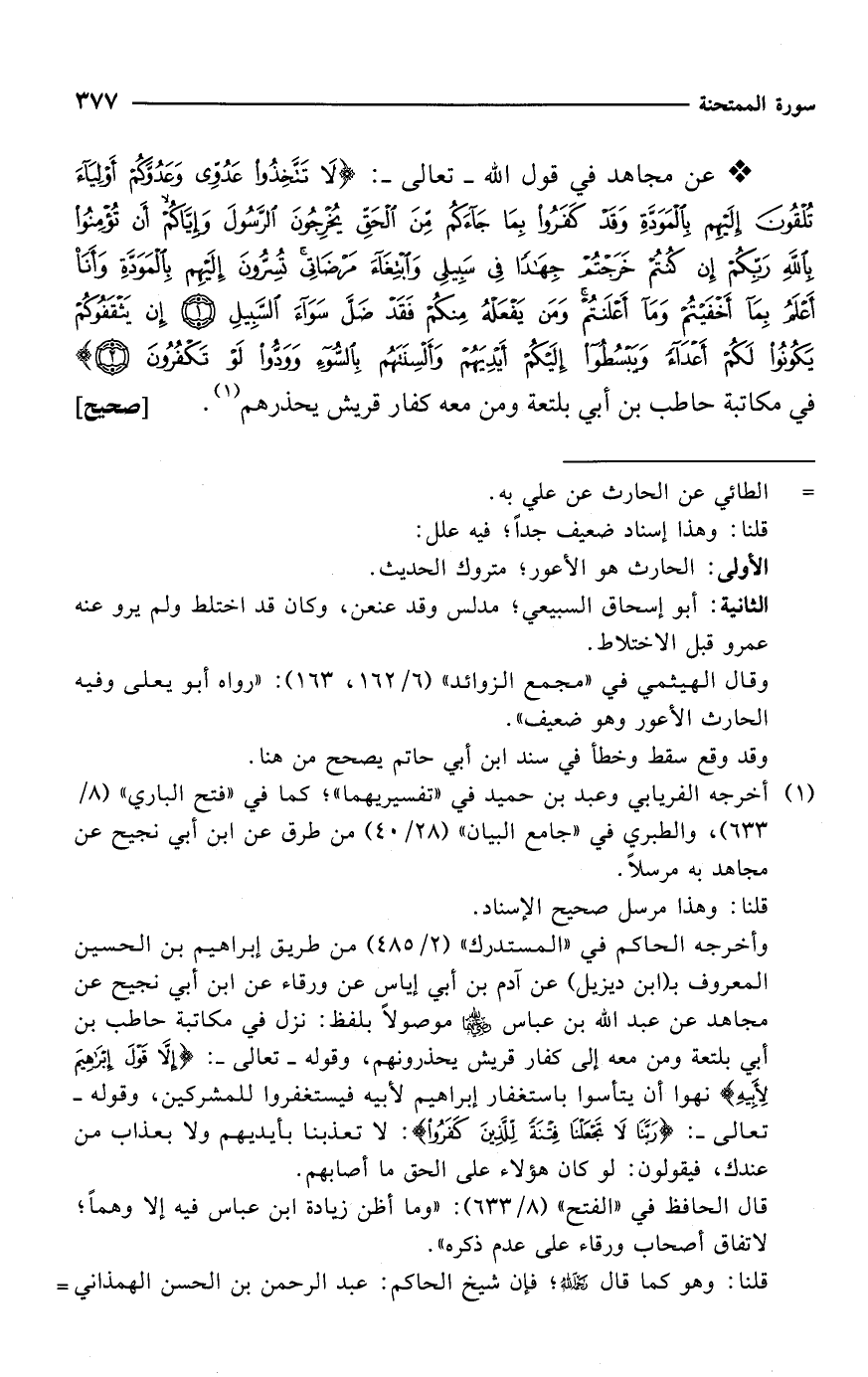 * عن مجاهد في قول الله -تعالى-: {يَاأَيُّهَا الَّذِينَ آمَنُوا لَا تَتَّخِذُوا عَدُوِّي وَعَدُوَّكُمْ أَوْلِيَاءَ تُلْقُونَ إِلَيْهِمْ بِالْمَوَدَّةِ وَقَدْ كَفَرُوا بِمَا جَاءَكُمْ مِنَ الْحَقِّ يُخْرِجُونَ الرَّسُولَ وَإِيَّاكُمْ أَنْ تُؤْمِنُوا بِاللَّهِ رَبِّكُمْ إِنْ كُنْتُمْ خَرَجْتُمْ جِهَادًا فِي سَبِيلِي وَابْتِغَاءَ مَرْضَاتِي تُسِرُّونَ إِلَيْهِمْ بِالْمَوَدَّةِ وَأَنَا أَعْلَمُ بِمَا أَخْفَيْتُمْ وَمَا أَعْلَنْتُمْ وَمَنْ يَفْعَلْهُ مِنْكُمْ فَقَدْ ضَلَّ سَوَاءَ السَّبِيلِ (1) إِنْ يَثْقَفُوكُمْ يَكُونُوا لَكُمْ أَعْدَاءً وَيَبْسُطُوا إِلَيْكُمْ أَيْدِيَهُمْ وَأَلْسِنَتَهُمْ بِالسُّوءِ وَوَدُّوا لَوْ تَكْفُرُونَ (2)} في مكاتبة حاطب بن أبي بلتعة ومن معه كفار قريش يحذرهم (¬1). [صحيح]