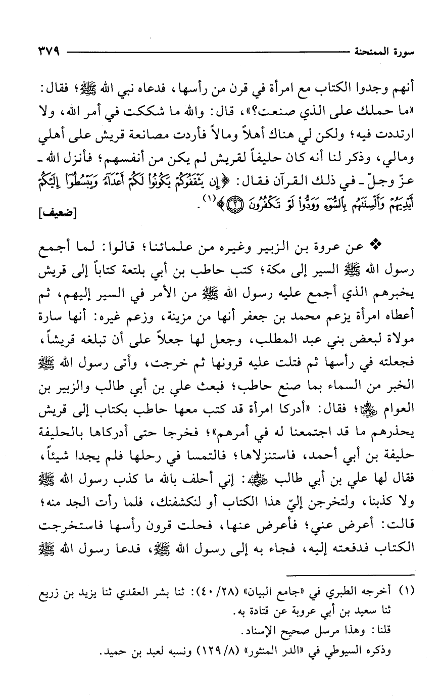 * عن عروة بن الزبير وغيره من علمائنا، قالوا: لما أجمع رسول الله - صلى الله عليه وسلم - السير إلى مكة؛ كتب حاطب بن أبي بلتعة كتاباً إلى قريش يخبرهم الذي أجمع عليه رسول الله - صلى الله عليه وسلم - من الأمر في السير إليهم، ثم أعطاه امرأة يزعم محمد بن جعفر أنها من مزينة، وزعم غيره: أنها سارة مولاة لبعض بني عبد المطلب، وجعل لها جعلاً على أن تبلغه قريشاً، فجعلته في رأسها ثم فتلت عليه قرونها ثم خرجت، وأتى رسول الله - صلى الله عليه وسلم - الخبر من السماء بما صنع حاطب؛ فبعث علي بن أبي طالب والزبير بن العوام -رضي الله عنهما-؛ فقال: "أدركا امرأة قد كتب معها حاطب بكتاب إلى قريش يحذرهم ما قد اجتمعنا له في أمرهم"؛ فخرجا حتى أدركاها بالحليفة حليفة بن أبي أحمد، فاستنزلاها؛ فالتمسا في رحلها فلم يجدا شيئاً، فقال لها علي بن أبي طالب -رضي الله عنه-: إني أحلف بالله ما كذب رسول الله - صلى الله عليه وسلم - ولا كذبنا، ولتخرجن إليّ هذا الكتاب أو لنكشفنك، فلما رأت الجد منه؛ قالت: أعرض عني؛ فأعرض عنها، فحلت قرون رأسها فاستخرجت الكتاب فدفعته إليه، فجاء به إلى رسول الله - صلى الله عليه وسلم -، فدعا رسول الله - صلى الله عليه وسلم -