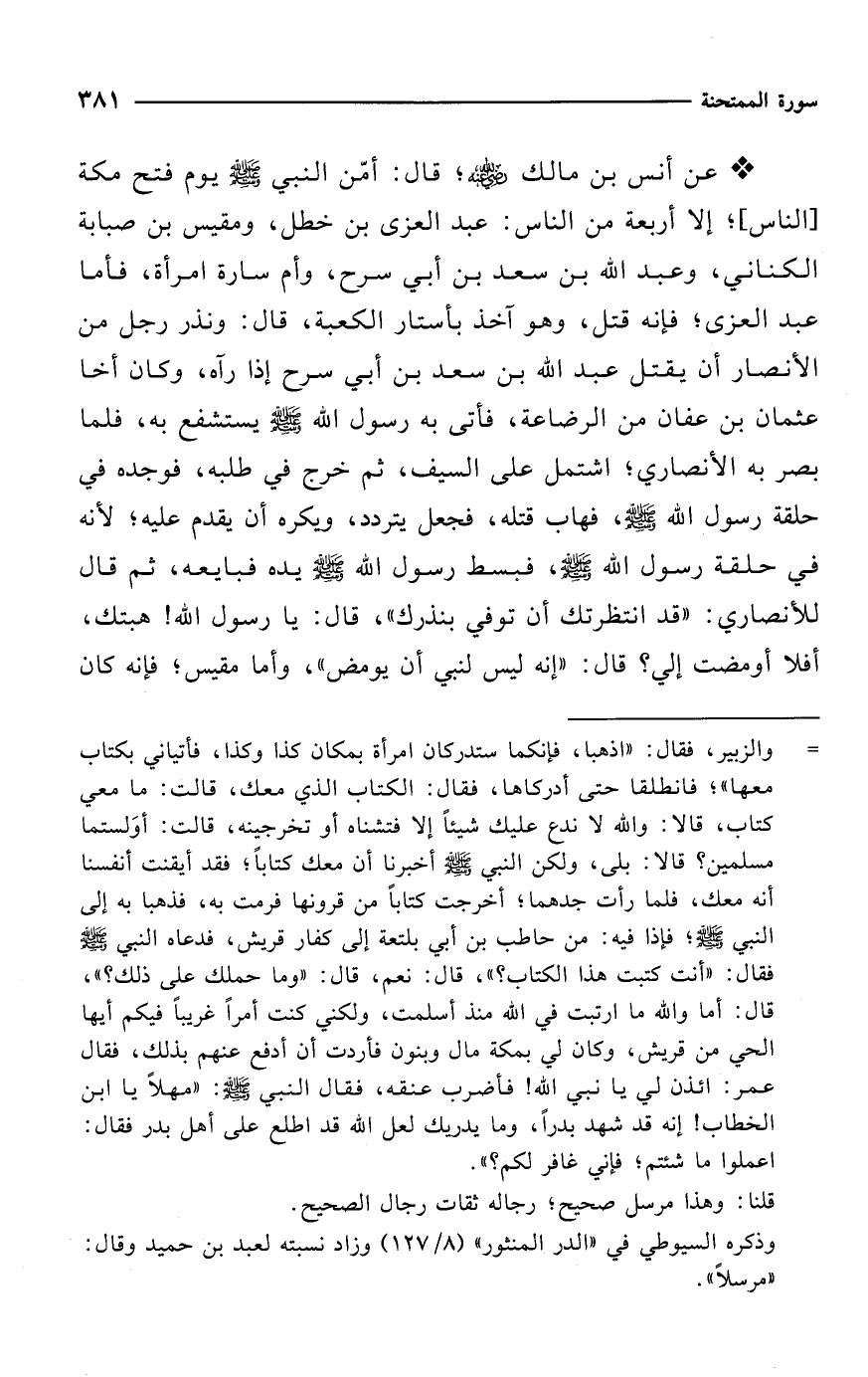 * عن أنس بن مالك -رضي الله عنه-؛ قال: أمّن النبي - صلى الله عليه وسلم - يوم فتح مكة [الناس]؛ إلا أربعة من الناس: عبد العزى بن خطل، ومقيس بن صبابة الكناني، وعبد الله بن سعد بن أبي سرح، وأم سارة امرأة، فأما عبد العزى؛ فإنه قتل، وهو آخذ بأستار الكعبة، قال: ونذر رجل من الأنصار أن يقتل عبد الله بن سعد بن أبي سرح إذا رآه، وكان أخا عثمان بن عفان من الرضاعة، فأتى به رسول الله - صلى الله عليه وسلم - يستشفع به، فلما بصر به الأنصاري؛ اشتمل على السيف، ثم خرج في طلبه، فوجده في حلقة رسول الله - صلى الله عليه وسلم -، فهاب قتله، فجعل يتردد، ويكره أن يقدم عليه؛ لأنه في حلقة رسول الله - صلى الله عليه وسلم -، فبسط رسول الله - صلى الله عليه وسلم - يده فبايعه، ثم قال للأنصاري: "قد انتظرتك أن توفي بنذرك"، قال: يا رسول الله! هبتك، أفلا أومضت إلي؟ قال: "إنه ليس لنبي أن يومض"، وأما مقيس؛ فإنه كان