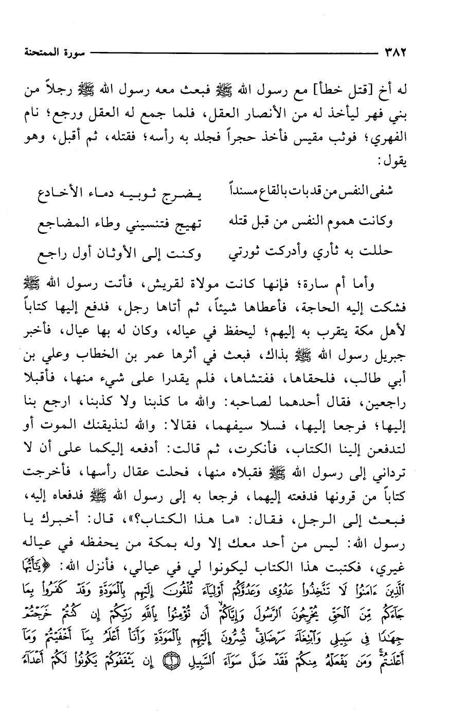وأما أم سارة؛ فإنها كانت مولاة لقريش، فأتت رسول الله - صلى الله عليه وسلم - فشكت إليه الحاجة، فأعطاها شيئاً، ثم أتاها رجل، فدفع إليها كتاباً لأهل مكة يتقرب به إليهم؛ ليحفظ في عياله، وكان له بها عيال، فأخبر جبريل رسول الله - صلى الله عليه وسلم - بذاك، فبعث في أثرها عمر بن الخطاب وعلي بن أبي طالب، فلحقاها، ففتشاها، فلم يقدرا على شيء منها، فأقبلا راجعين، فقال أحدهما لصاحبه: والله ما كذبنا ولا كذبنا، ارجع بنا إليها؛ فرجعا إليها، فسلا سيفهما، فقالا: والله لنذيقنك الموت أو لتدفعن إلينا الكتاب، فأنكرت، ثم قالت: أدفعه إليكما على أن لا ترداني إلى رسول الله - صلى الله عليه وسلم - فقبلاه منها، فحلت عقال رأسها، فأخرجت كتاباً من قرونها فدفعته إليهما، فرجعا به إلى رسول الله - صلى الله عليه وسلم - فدفعاه إليه، فبعث إلى الرجل، فقال: "ما هذا الكتاب؟ "، قال: أخبرك يا رسول الله: ليس من أحد معك إلا وله بمكة من يحفظه في عياله غيري، فكتبت هذا الكتاب ليكونوا لي في عيالي، فأنزل الله: {يَاأَيُّهَا الَّذِينَ آمَنُوا لَا تَتَّخِذُوا عَدُوِّي وَعَدُوَّكُمْ أَوْلِيَاءَ تُلْقُونَ إِلَيْهِمْ بِالْمَوَدَّةِ وَقَدْ كَفَرُوا بِمَا جَاءَكُمْ مِنَ الْحَقِّ يُخْرِجُونَ الرَّسُولَ وَإِيَّاكُمْ أَنْ تُؤْمِنُوا بِاللَّهِ رَبِّكُمْ إِنْ كُنْتُمْ خَرَجْتُمْ جِهَادًا فِي سَبِيلِي وَابْتِغَاءَ مَرْضَاتِي تُسِرُّونَ إِلَيْهِمْ بِالْمَوَدَّةِ وَأَنَا أَعْلَمُ بِمَا أَخْفَيْتُمْ وَمَا أَعْلَنْتُمْ وَمَنْ يَفْعَلْهُ مِنْكُمْ فَقَدْ ضَلَّ سَوَاءَ السَّبِيلِ (1) إِنْ يَثْقَفُوكُمْ يَكُونُوا لَكُمْ أَعْدَاءً