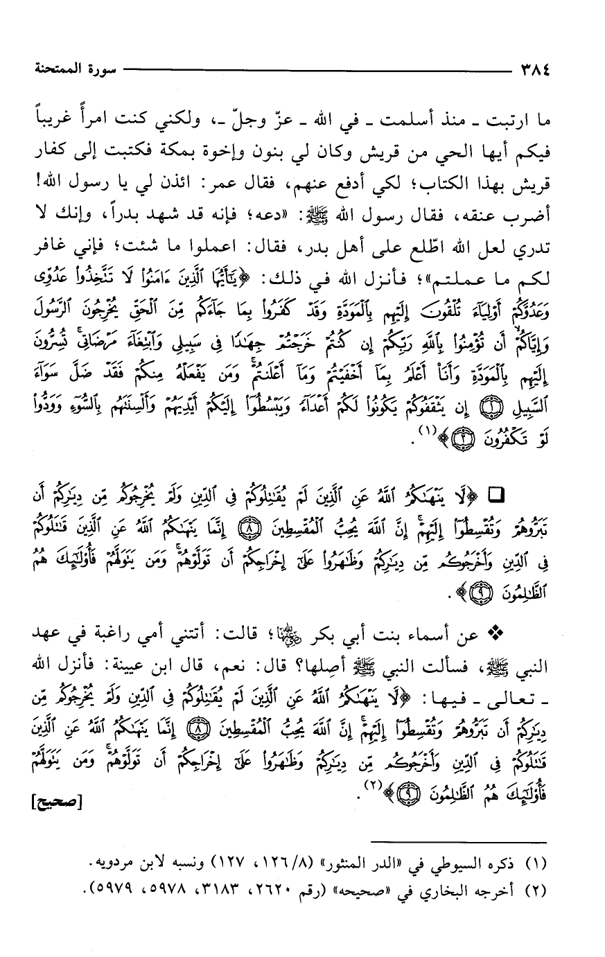 * عن أسماء بنت أبي بكر -رضي الله عنهما-؛ قالت: أتتني أمي راغبة في عهد النبي - صلى الله عليه وسلم -، فسألت النبي - صلى الله عليه وسلم - أصِلها؟ قال: نعم، قال ابن عيينة: فأنزل الله -تعالى- فيها: {لَا يَنْهَاكُمُ اللَّهُ عَنِ الَّذِينَ لَمْ يُقَاتِلُوكُمْ فِي الدِّينِ وَلَمْ يُخْرِجُوكُمْ مِنْ دِيَارِكُمْ أَنْ تَبَرُّوهُمْ وَتُقْسِطُوا إِلَيْهِمْ إِنَّ اللَّهَ يُحِبُّ الْمُقْسِطِينَ (8) إِنَّمَا يَنْهَاكُمُ اللَّهُ عَنِ الَّذِينَ قَاتَلُوكُمْ فِي الدِّينِ وَأَخْرَجُوكُمْ مِنْ دِيَارِكُمْ وَظَاهَرُوا عَلَى إِخْرَاجِكُمْ أَنْ تَوَلَّوْهُمْ وَمَنْ يَتَوَلَّهُمْ فَأُولَئِكَ هُمُ الظَّالِمُونَ (9)} (¬2). [صحيح]