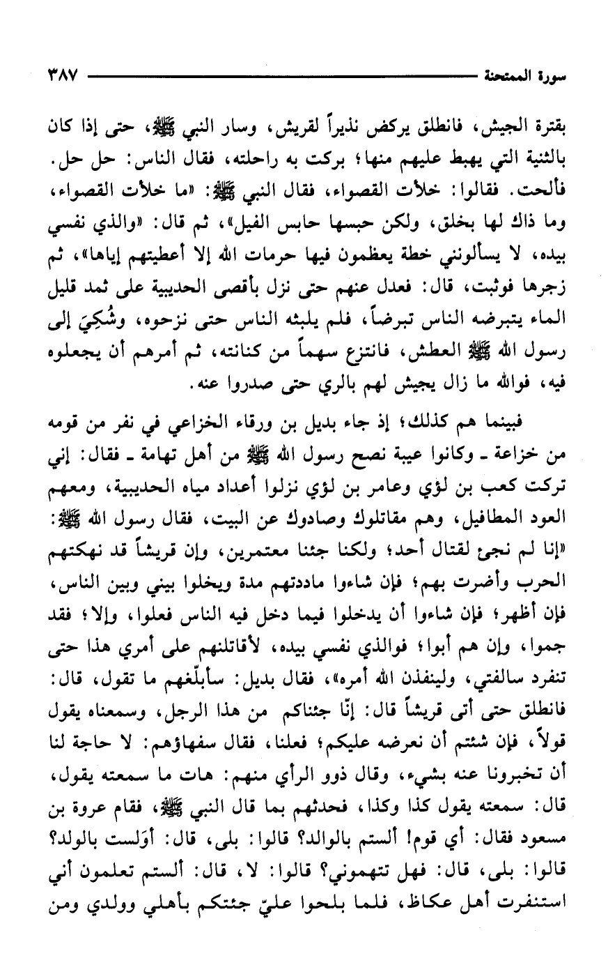 فبينما هم كذلك؛ إذ جاء بديل بن ورقاء الخزاعي في نفر من قومه من خزاعة -وكانوا عيبة نصح رسول الله - صلى الله عليه وسلم - من أهل تهامة- فقال: إني تركت كعب بن لؤي وعامر بن لؤي نزلوا أعداد مياه الحديبية، ومعهم العود المطافيل، وهم مقاتلوك وصادوك عن البيت، فقال رسول الله - صلى الله عليه وسلم -: "إنا لم نجئ لقتال أحد؛ ولكنا جئنا معتمرين، وإن قريشاً قد نهكتهم الحرب وأضرت بهم؛ فإن شاءوا ماددتهم مدة ويخلوا بيني وبين الناس، فإن أظهر؛ فإن شاءوا أن يدخلوا فيما دخل فيه الناس فعلوا، وإلا؛ فقد جموا، كان هم أبوا؛ فوالذي نفسيم بيده، لأقاتلنهم على أمري هذا حتى تنفرد سالفتي، ولينفذن الله أمره"، فقال بديل: سأبلّغهم ما تقول، قال: فانطلق حتى أتى قريشاً قال: إنّا جئناكم من هذا الرجل، وسمعناه يقول قولاً، فإن شئتم أن نعرضه عليكم؛ فعلنا، فقال سفهاؤهم: لا حاجة لنا أن تخبرونا عنه بشيء، وقال ذوو الرأي منهم: هات ما سمعته يقول، قال: سمعته يقول كذا وكذا، فحدثهم بما قال النبي - صلى الله عليه وسلم -، فقام عروة بن مسعود فقال: أي قوم! ألستم بالوالد؟ قالوا: بلى، قال: أوَلست بالولد؟ قالوا: بلى، قال: فهل تتهموني؟ قالوا: لا، قال: ألستم تعلمون أني استنفرت أهل عكاظ، فلما بلحوا عليّ جئتكم بأهلي وولدي ومن