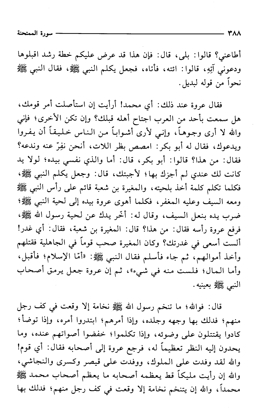 فقال عروة عند ذلك: أي محمد! أرأيت إن استأصلت أمر قومك، هل سمعت بأحد من العرب اجتاح أهله قبلك؟ وإن تكن الأخرى؛ فإني والله لا أرى وجوهاً، وإني لأرى أشواباً من الناس خليقاً أن يفروا ويدعوك، فقال له أبو بكر: امصص بظر اللات، أنحن نفِرّ عنه وندعه؟ فقال: من هذا؟ قالوا: أبو بكر، قال: أما والذي نفسي بيده؛ لولا يد كانت لك عندي لم أجزك بها؛ لأجبتك، قال: وجعل يكلم النبي - صلى الله عليه وسلم -، فكلما تكلم أخذ بلحيته، والمغيرة بن شعبة قائم على رأس النبي - صلى الله عليه وسلم - ومعه السيف وعليه المغفر، فكلما أهوى عروة بيده إلى لحية النبي - صلى الله عليه وسلم -؛ ضرب يده بنعل السيف، وقال له: أخّر يدك عن لحية رسول الله - صلى الله عليه وسلم -، فرفع عروة رأسه فقال: من هذا؟ قال: المغيرة بن شعبة، فقال: أي غدر! ألست أسعى في غدرتك؟ وكان المغيرة صحب قوماً في الجاهلية فقتلهم وأخذ أموالهم، ثم جاء فأسلم فقال النبي - صلى الله عليه وسلم -: "أمّا الإسلام؛ فأقبل، وأما المال؛ فلست منه في شيء"، ثم إن عروة جعل يرمق أصحاب النبي - صلى الله عليه وسلم - بعينيه.
