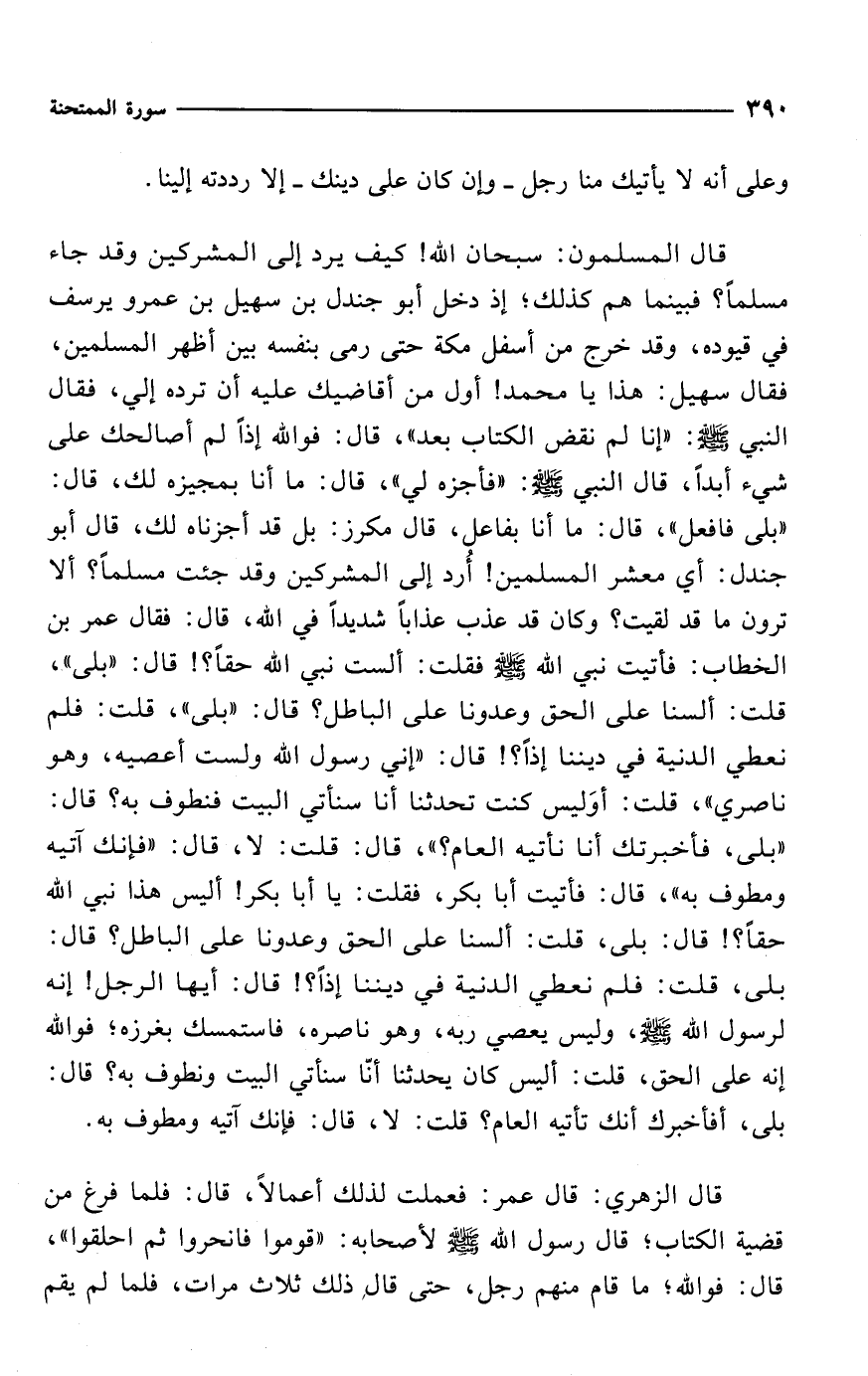 قال المسلمون: سبحان الله! كيف يرد إلى المشركين وقد جاء مسلماً؟ فبينما هم كذلك؛ إذ دخل أبو جندل بن سهيل بن عمرو يرسف في قيوده، وقد خرج من أسفل مكة حتى رمى بنفسه بين أظهر المسلمين، فقال سهيل: هذا يا محمد! أول من أقاضيك عليه أن ترده إلي، فقال النبي - صلى الله عليه وسلم -: "إنا لم نقض الكتاب بعد"، قال: فوالله إذاً لم أصالحك على شيء أبداً، قال النبي - صلى الله عليه وسلم -: "فأجزه لي"، قال: ما أنا بمجيزه لك، قال: "بلى فافعل"، قال: ما أنا بفاعل، قال مكرز: بل قد أجزناه لك، قال أبو جندل: أي معشر المسلمين! أُرد إلى المشركين وقد جئت مسلماً؟ ألا ترون ما قد لقيت؟ وكان قد عذب عذاباً شديداً في الله، قال: فقال عمر بن الخطاب: فأتيت نبي الله - صلى الله عليه وسلم - فقلت: ألست نبي الله حقاً؟! قال: "بلى"، قلت: ألسنا على الحق وعدونا على الباطل؟ قال: "بلى"، قلت: فلم نعطي الدنية في ديننا إذاً؟! قال: "إني رسول الله ولست أعصيه، وهو ناصري"، قلت: أوَليس كنت تحدثنا أنا سنأتي البيت فنطوف به؟ قال: "بلى، فأخبرتك أنا نأتيه العام؟ "، قال: قلت: لا، قال: "فإنك آتيه ومطوف به"، قال: فأتيت أبا بكر، فقلت: يا أبا بكر! أليس هذا نبي الله حقاً؟! قال: بلى، قلت: ألسنا على الحق وعدونا على الباطل؟ قال: بلى، قلت: فلم نعطي الدنية في ديننا إذاً؟! قال: أيها الرجل! إنه لرسول الله - صلى الله عليه وسلم -، وليس يعصي ربه، وهو ناصره، فاستمسك بغرزه؛ فوالله إنه على الحق، قلت: أليس كان يحدثنا أنّا سنأتي البيت ونطوف به؟ قال: بلى، أفأخبرك أنك تأتيه العام؟ قلت: لا، قال: فإنك آتيه ومطوف به.