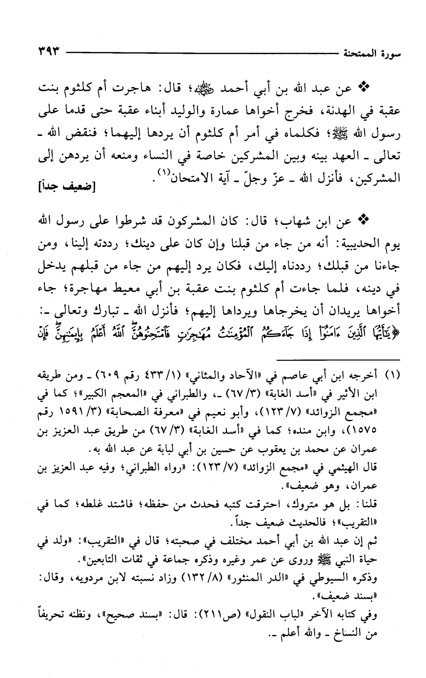 * عن عبد الله بن أبي أحمد -رضي الله عنه-؛ قال: هاجرت أم كلثوم بنت عقبة في الهدنة، فخرج أخواها عمارة والوليد أبناء عقبة حتى قدما على رسول الله - صلى الله عليه وسلم -؛ فكلماه في أمر أم كلثوم أن يردها إليهما؛ فنقض الله - تعالى- العهد بينه وبين المشركين خاصة في النساء ومنعه أن يردهن إلى المشركين، فأنزل الله -عزّ وجلّ- آية الامتحان (¬1). [ضعيف جداً]
