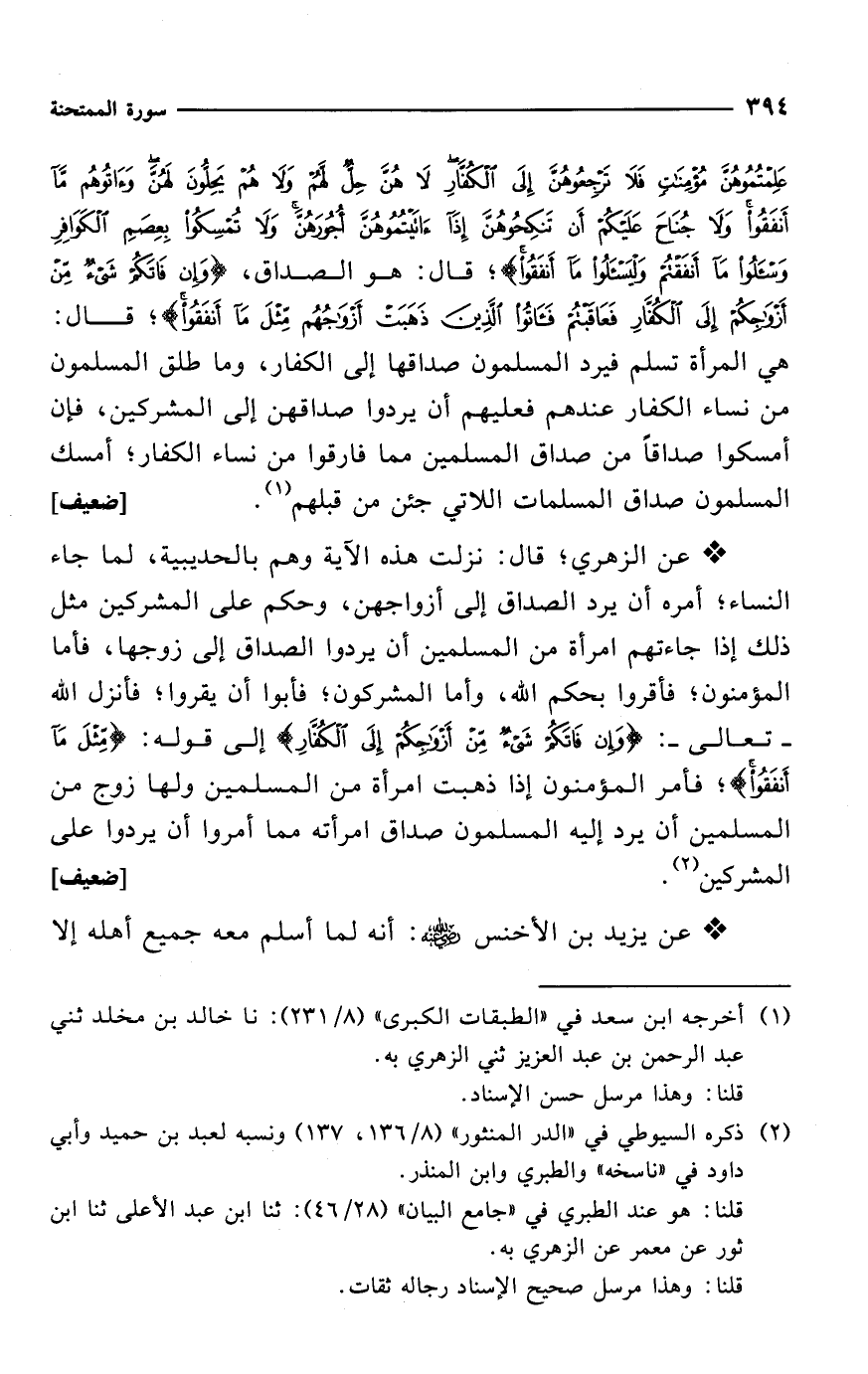 عَلِمْتُمُوهُنَّ مُؤْمِنَاتٍ فَلَا تَرْجِعُوهُنَّ إِلَى الْكُفَّارِ لَا هُنَّ حِلٌّ لَهُمْ وَلَا هُمْ يَحِلُّونَ لَهُنَّ وَآتُوهُمْ مَا أَنْفَقُوا وَلَا جُنَاحَ عَلَيْكُمْ أَنْ تَنْكِحُوهُنَّ إِذَا آتَيْتُمُوهُنَّ أُجُورَهُنَّ وَلَا تُمْسِكُوا بِعِصَمِ الْكَوَافِرِ وَاسْأَلُوا مَا أَنْفَقْتُمْ وَلْيَسْأَلُوا مَا أَنْفَقُوا}؛ قال: هو الصداق، {وَإِنْ فَاتَكُمْ شَيْءٌ مِنْ أَزْوَاجِكُمْ إِلَى الْكُفَّارِ فَعَاقَبْتُمْ فَآتُوا الَّذِينَ ذَهَبَتْ أَزْوَاجُهُمْ مِثْلَ مَا أَنْفَقُوا}؛ قال: هي المرأة تسلم فيرد المسلمون صداقها إلى الكفار، وما طلق المسلمون من نساء الكفار عندهم فعليهم أن يردوا صداقهن إلى المشركين، فإن أمسكوا صداقاً من صداق المسلمين مما فارقوا من نساء الكفار؛ أمسك المسلمون صداق المسلمات اللاتي جئن من قبلهم (¬1). [ضعيف]