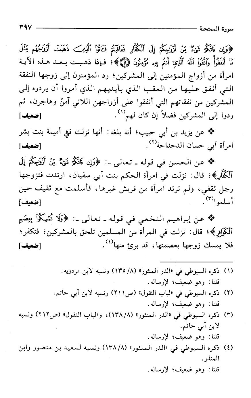 * عن الحسن في قوله -تعالى-: {وَإِنْ فَاتَكُمْ شَيْءٌ مِنْ أَزْوَاجِكُمْ إِلَى الْكُفَّارِ}؛ قال: نزلت في امرأة الحكم بنت أبي سفيان، ارتدت فتزوجها رجل ثقفي، ولم ترتد امرأة من قريش غيرها، فأسلمت مع ثقيف حين أسلموا (¬3). [ضعيف]