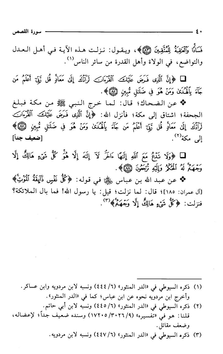 * عن الضحاك؛ قال: لما خرج النبي - صلى الله عليه وسلم - من مكة فبلغ الجحفة؛ اشتاق إلى مكة؛ فأنزل الله: {إِنَّ الَّذِي فَرَضَ عَلَيْكَ الْقُرْآنَ لَرَادُّكَ إِلَى مَعَادٍ قُلْ رَبِّي أَعْلَمُ مَنْ جَاءَ بِالْهُدَى وَمَنْ هُوَ فِي ضَلَالٍ مُبِينٍ (85)} إلى مكة (¬2). [ضعيف جداً]