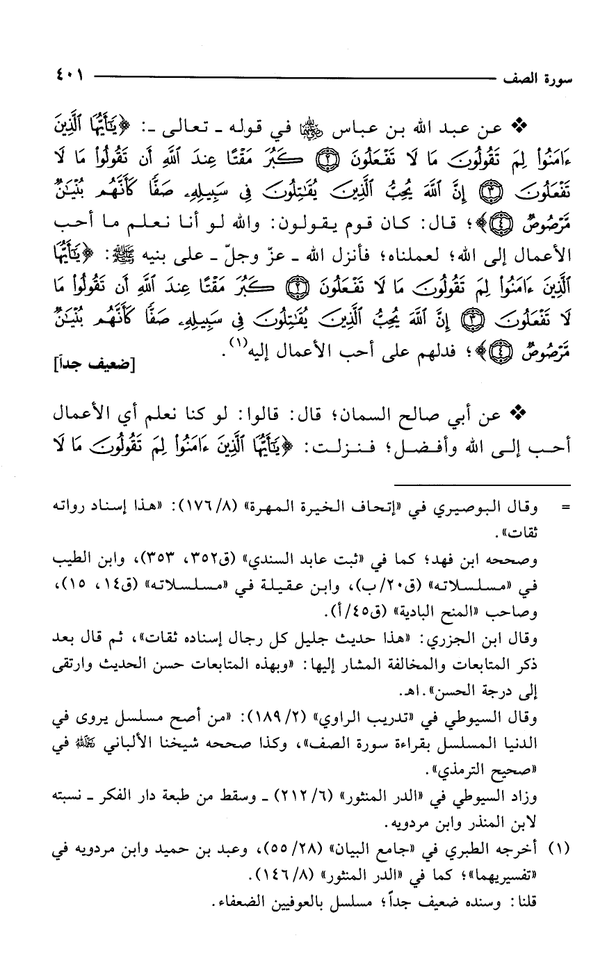 * عن عبد الله بن عباس -رضي الله عنهما- في قوله -تعالى-: {يَاأَيُّهَا الَّذِينَ آمَنُوا لِمَ تَقُولُونَ مَا لَا تَفْعَلُونَ (2) كَبُرَ مَقْتًا عِنْدَ اللَّهِ أَنْ تَقُولُوا مَا لَا تَفْعَلُونَ (3) إِنَّ اللَّهَ يُحِبُّ الَّذِينَ يُقَاتِلُونَ فِي سَبِيلِهِ صَفًّا كَأَنَّهُمْ بُنْيَانٌ مَرْصُوصٌ (4)}؛ قال: كان قوم يقولون: والله لو أنا نعلم ما أحب الأعمال إلى الله؛ لعملناه؛ فأنزل الله -عزّ وجلّ- علي نبيه - صلى الله عليه وسلم -: {يَاأَيُّهَا الَّذِينَ آمَنُوا لِمَ تَقُولُونَ مَا لَا تَفْعَلُونَ (2) كَبُرَ مَقْتًا عِنْدَ اللَّهِ أَنْ تَقُولُوا مَا لَا تَفْعَلُونَ (3) إِنَّ اللَّهَ يُحِبُّ الَّذِينَ يُقَاتِلُونَ فِي سَبِيلِهِ صَفًّا كَأَنَّهُمْ بُنْيَانٌ مَرْصُوصٌ (4)}؛ فدلهم على أحب الأعمال إليه (¬1). [ضعيف جداً]