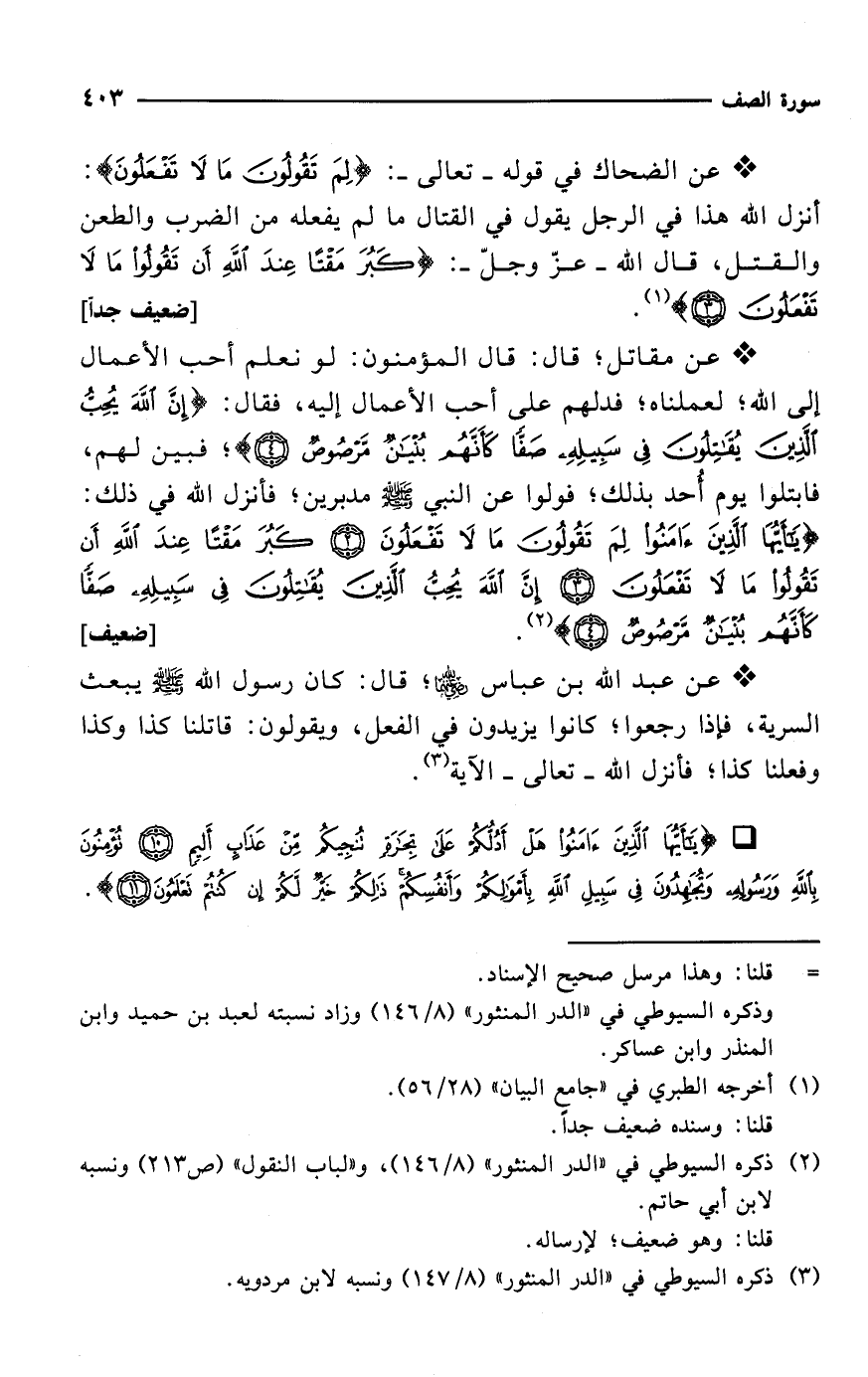 * عن الضحاك في قوله -تعالى-: {لِمَ تَقُولُونَ مَا لَا تَفْعَلُونَ}: أنزل الله هذا في الرجل يقول في القتال ما لم يفعله من الضرب والطعن والقتل، قال الله -عزّ وجلّ-: {كَبُرَ مَقْتًا عِنْدَ اللَّهِ أَنْ تَقُولُوا مَا لَا تَفْعَلُونَ (3)} (¬1). [ضعيف جداً]