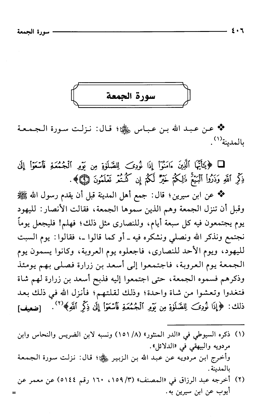 * عن ابن سيرين؛ قال: جمع أهل المدينة قبل أن يقدم رسول الله - صلى الله عليه وسلم - وقبل أن تنزل الجمعة وهم الذين سموها الجمعة، فقالت الأنصار: لليهود يوم يجتمعون فيه كل سبعة أيام، وللنصارى مثل ذلك؛ فهلم! فليجعل يوماً نجتمع ونذكر الله ونصلي ونشكره فيه -أو كما قالوا-، فقالوا: يوم السبت لليهود، ويوم الأحد للنصارى، فاجعلوه يوم العروبة، وكانوا يسمون يوم الجمعة يوم العروبة، فاجتمعوا إلى أسعد بن زرارة فصلى بهم يومئذ وذكرهم فسموه الجمعة، حتى اجتمعوا إليه فذبح أسعد بن زرارة لهم شاة فتغدوا وتعشوا من شاة واحدة؛ وذلك لقلتهم؛ فأنزل الله في ذلك بعد ذلك: {إِذَا نُودِيَ لِلصَّلَاةِ مِنْ يَوْمِ الْجُمُعَةِ فَاسْعَوْا إِلَى ذِكْرِ اللَّهِ} (¬2). [ضعيف]