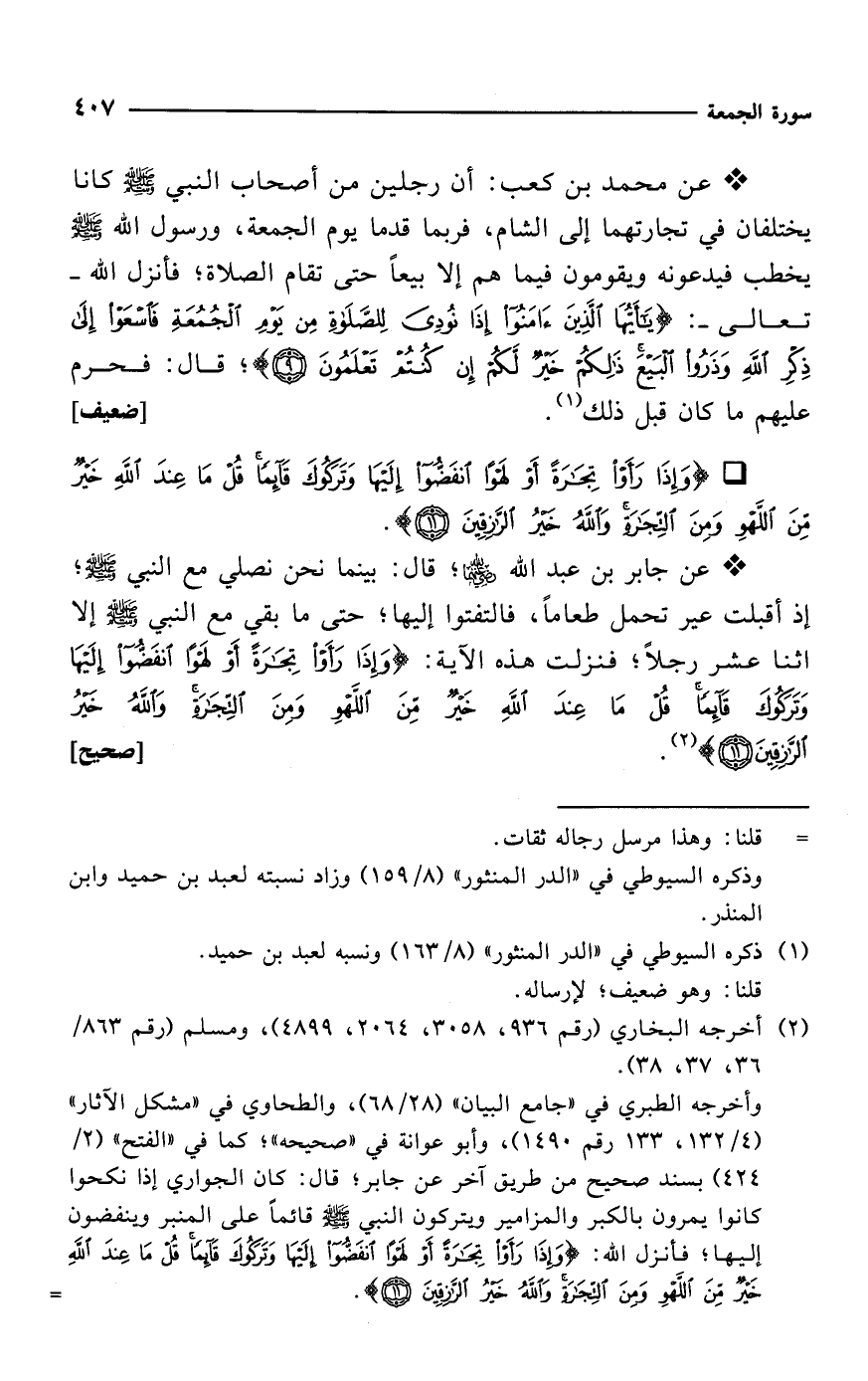 * عن جابر بن عبد الله -رضي الله عنهما-؛ قال: بينما نحن نصلي مع النبي - صلى الله عليه وسلم -؛ إذ أقبلت عير تحمل طعاماً، فالتفتوا إليها؛ حتى ما بقي مع النبي - صلى الله عليه وسلم - إلا اثنا عشر رجلاً؛ فنزلت هذه الآية: {وَإِذَا رَأَوْا تِجَارَةً أَوْ لَهْوًا انْفَضُّوا إِلَيْهَا وَتَرَكُوكَ قَائِمًا قُلْ مَا عِنْدَ اللَّهِ خَيْرٌ مِنَ اللَّهْوِ وَمِنَ التِّجَارَةِ وَاللَّهُ خَيْرُ الرَّازِقِينَ (11)} (¬2). [صحيح]