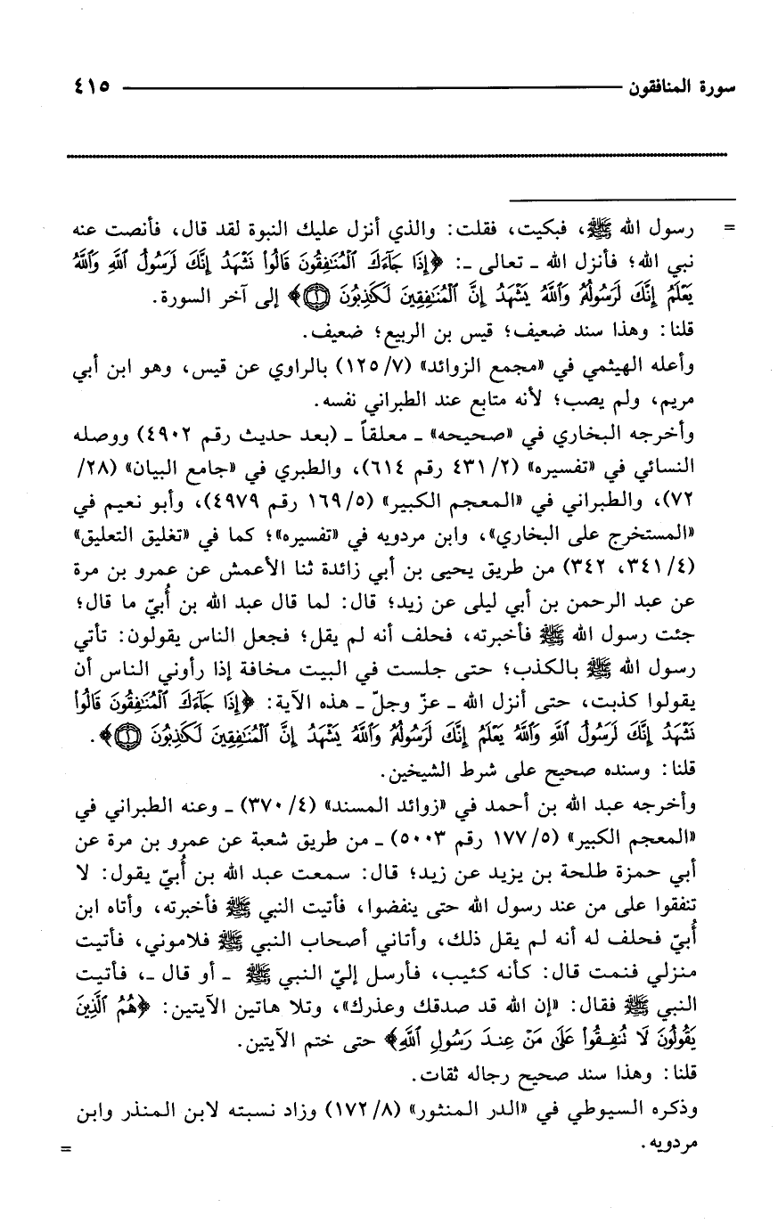 = رسول الله - صلى الله عليه وسلم -، فبكيت، فقلت: والذي أنزل عليك النبوة لقد قال، فأنصت عنه نبي الله؛ فأنزل الله -تعالى-: {إِذَا جَاءَكَ الْمُنَافِقُونَ قَالُوا نَشْهَدُ إِنَّكَ لَرَسُولُ اللَّهِ وَاللَّهُ يَعْلَمُ إِنَّكَ لَرَسُولُهُ وَاللَّهُ يَشْهَدُ إِنَّ الْمُنَافِقِينَ لَكَاذِبُونَ (1)} إلى آخر السورة.
