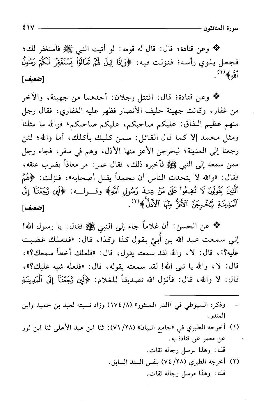 * وعن قتادة؛ قال: اقتتل رجلان: أحدهما من جهينة، والآخر من غفار، وكانت جهينة حليف الأنصار فظهر عليه الغفاري، فقال رجل منهم عظيم النفاق: عليكم صاحبكم، عليكم صاحبكم؛ فوالله ما مثلنا ومثل محمد إلا كما قال القائل: سمن كلبك يأكلك، أما والله؛ لئن رجعنا إلى المدينة؛ ليخرجن الأعز منها الأذل، وهم في سفر، فجاء رجل ممن سمعه إلى النبي - صلى الله عليه وسلم - فأخبره ذلك، فقال عمر: مر معاذاً يضرب عنقه، فقال: "والله لا يتحدث الناس أن محمداً يقتل أصحابه"، فنزلت: {هُمُ الَّذِينَ يَقُولُونَ لَا تُنْفِقُوا عَلَى مَنْ عِنْدَ رَسُولِ اللَّهِ} وقوله: {لَئِنْ رَجَعْنَا إِلَى الْمَدِينَةِ لَيُخْرِجَنَّ الْأَعَزُّ مِنْهَا الْأَذَلَّ} (¬2). [ضعيف]