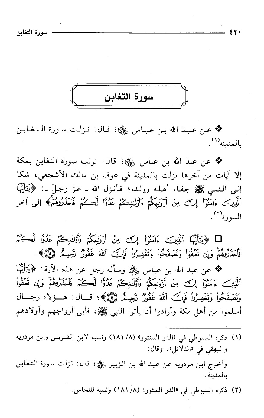 * عن عبد الله بن عباس -رضي الله عنهما- وسأله رجل عن هذه الآية: {يَاأَيُّهَا الَّذِينَ آمَنُوا إِنَّ مِنْ أَزْوَاجِكُمْ وَأَوْلَادِكُمْ عَدُوًّا لَكُمْ فَاحْذَرُوهُمْ وَإِنْ تَعْفُوا وَتَصْفَحُوا وَتَغْفِرُوا فَإِنَّ اللهَ غَفُورٌ رَحِيمٌ (14)}؛ قال: هؤلاء رجال أسلموا من أهل مكة وأرادوا أن يأتوا النبي - صلى الله عليه وسلم -، فأبى أزواجهم وأولادهم