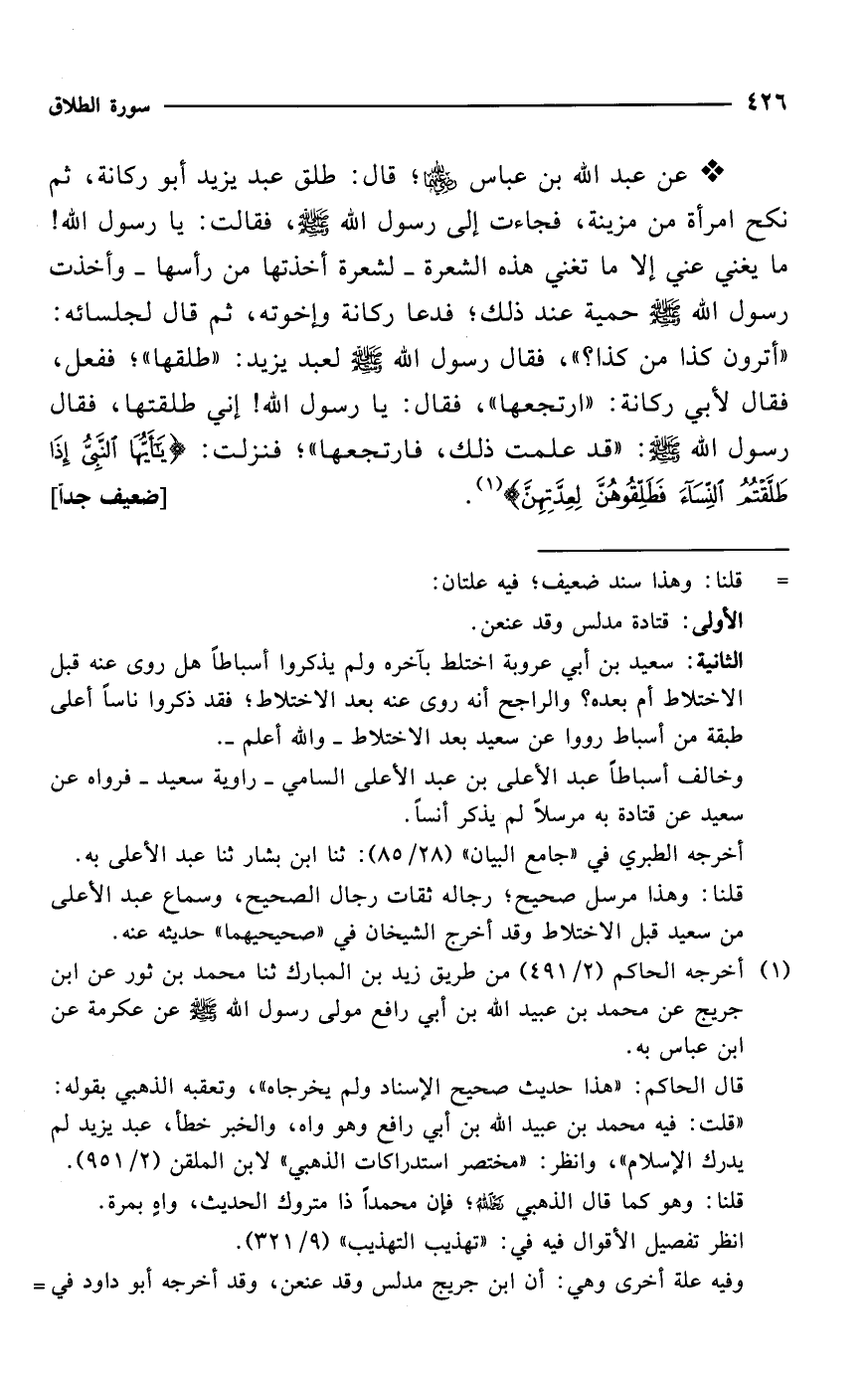 * عن عبد الله بن عباس -رضي الله عنهما-؛ قال: طلق عبد يزيد أبو ركانة، ثم نكح امرأة من مزينة، فجاءت إلى رسول الله - صلى الله عليه وسلم -، فقالت: يا رسول الله! ما يغني عني إلا ما تغني هذه الشعرة -لشعرة أخذتها من رأسها- وأخذت رسول الله - صلى الله عليه وسلم - حمية عند ذلك؛ فدعا ركانة وإخوته، ثم قال لجلسائه: "أترون كذا من كذا؟ "، فقال رسول الله - صلى الله عليه وسلم - لعبد يزيد: "طلقها"؛ ففعل، فقال لأبي ركانة: "ارتجعها"، فقال: يا رسول الله! إني طلقتها، فقال رسول الله - صلى الله عليه وسلم -: "قد علمت ذلك، فارتجعها"؛ فنزلت: {يَاأَيُّهَا النَّبِيُّ إِذَا طَلَّقْتُمُ النِّسَاءَ فَطَلِّقُوهُنَّ لِعِدَّتِهِنَّ} (¬1). [ضعيف جداً]