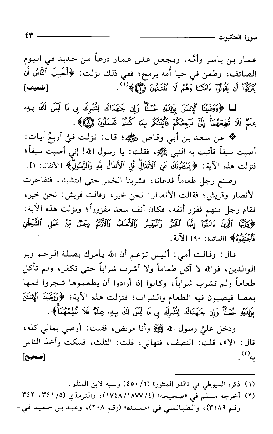 قال: وقالت أمي: أليس تزعم أن الله يأمرك بصلة الرحم وبر الوالدين، فوالله لا آكل طعاماً ولا أشرب شراباً حتى تكفر، ولم تأكل طعاماً ولم تشرب شراباً، وكانوا إذا أرادوا أن يطعموها شجروا فمها بعصا فيصبون فيه الطعام والشراب؛ فنزلت هذه الآية؛ {وَوَصَّيْنَا الْإِنْسَانَ بِوَالِدَيْهِ حُسْنًا وَإِنْ جَاهَدَاكَ لِتُشْرِكَ بِي مَا لَيْسَ لَكَ بِهِ عِلْمٌ فَلَا تُطِعْهُمَا}.