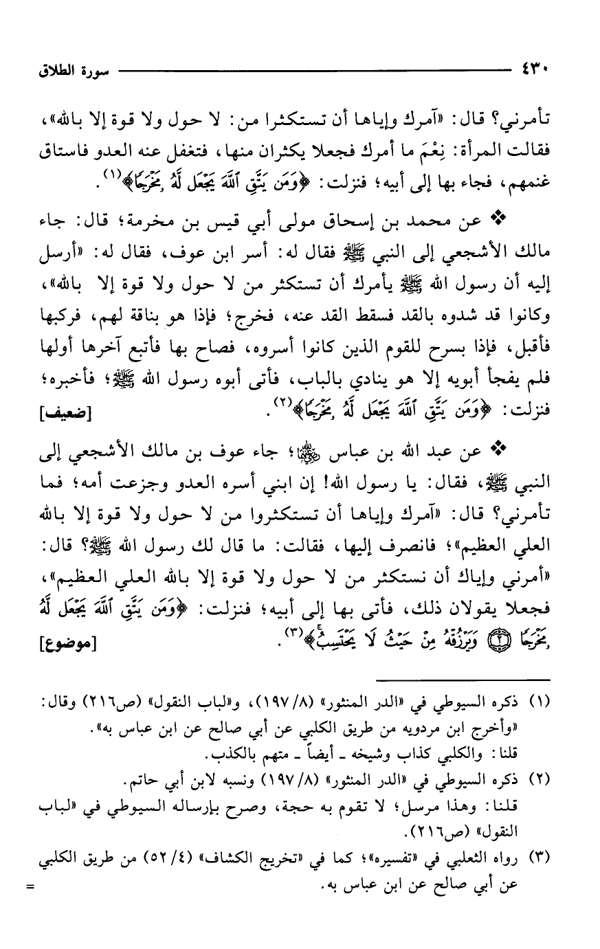 * عن عبد الله بن عباس -رضي الله عنهما-؛ جاء عوف بن مالك الأشجعي إلى النبي - صلى الله عليه وسلم -، فقال: يا رسول الله! إن ابني أسره العدو وجزعت أمه؛ فما تأمرني؟ قال: "آمرك وإياها أن تستكثروا من لا حول ولا قوة إلا بالله العلي العظيم"؛ فانصرف إليها، فقالت: ما قال لك رسول الله - صلى الله عليه وسلم -؟ قال: "أمرني وإياك أن نستكثر من لا حول ولا قوة إلا بالله العلي العظيم"، فجعلا يقولان ذلك، فأتى بها إلى أبيه؛ فنزلت: {وَمَنْ يَتَّقِ اللهَ يَجْعَلْ لَهُ مَخْرَجًا (2) وَيَرْزُقْهُ مِنْ حَيْثُ لَا يَحْتَسِبُ} (¬3). [موضوع]