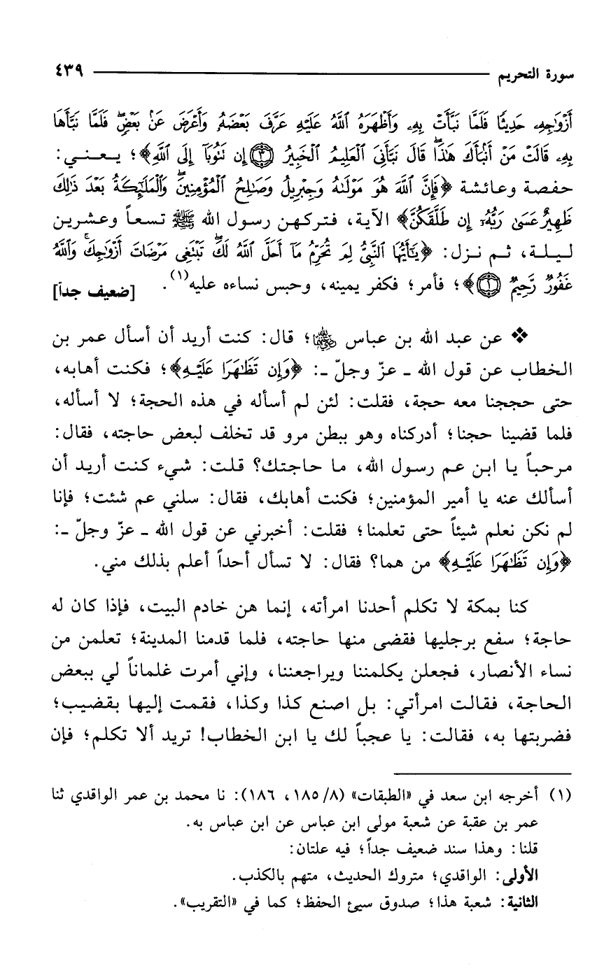 * عن عبد الله بن عباس -رضي الله عنهما-؛ قال: كنت أريد أن أسأل عمر بن الخطاب عن قول الله -عزّ وجلّ-: {وَإِنْ تَظَاهَرَا عَلَيْهِ}؛ فكنت أهابه، حتى حججنا معه حجة، فقلت: لئن لم أسأله في هذه الحجة؛ لا أسأله، فلما قضينا حجنا؛ أدركناه وهو ببطن مرو قد تخلف لبعض حاجته، فقال: مرحباً يا ابن عم رسول الله، ما حاجتك؟ قلت: شيء كنت أريد أن أسألك عنه يا أمير المؤمنين؛ فكنت أهابك، فقال: سلني عم شئت؛ فإنا لم نكن نعلم شيئاً حتى تعلمنا؛ فقلت: أخبرني عن قول الله -عزّ وجلّ-: {وَإِنْ تَظَاهَرَا عَلَيْهِ} من هما؟ فقال: لا تسأل أحداً أعلم بذلك مني.